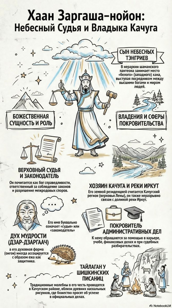 ⚖️⚖️⚖️ Познакомьтесь с могущественным сыном небесных Тэнгриев — Хааном Заргашой. Будучи «белым» (западным) ханом, он выступает посредником между высшими богами и миром людей. 🔹 Его главные роли: Верховный Судья, Законодатель и бог справедливости. Он отвечает за соблюдение законов и разрешение межродовых споров. Его имя буквально означает «судья». Духовная форма божества ассоциируется с Духом мудрости и защитником-ежом. 🔹 Сферы покровительства: К Хаану Заргаше обращаются за помощью в официальных и административных делах: 🔹 ✅ Карьера и учеба 🔹 ✅ Финансовые вопросы 🔹 ✅ Судебные разбирательства 🗺️ Земные владения: Его резиденцией считается Качугский регион (верховья Лены) и долина реки Иркут. Канал студии https://dzen.ru/id/670c7fe545d6d72caa724e37