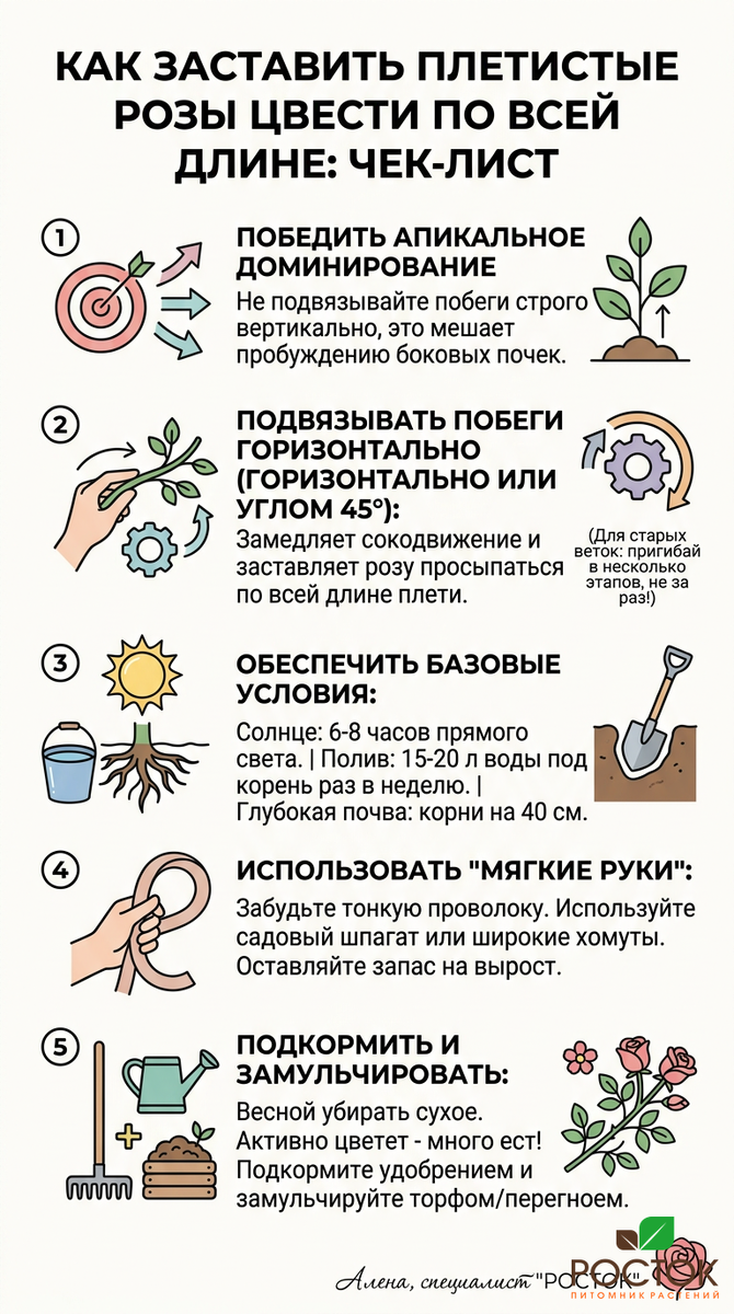 Всем привет! На связи Алёна — специалист по садовым растениям, которая каждый день в «Ростке» в буквальном смысле живет среди кустов и саженцев. Знаете, на что я чаще всего жалуюсь коллегам за чашкой чая? На «розы-солдатики». Это когда идешь мимо соседского забора, а там стоит красавица-роза: снизу голые, колючие «ноги», а три несчастных цветочка болтаются где-то в небесах. И хозяйка расстроена: «Алёна, сорт плохой, не цветет!» А сорт-то ни при чем. Просто розу привязали к опоре строго вертикально, как первоклассника на линейке. Так нельзя! У роз есть свой «кодекс поведения» — апикальное доминирование. Если ветка смотрит в небо, весь сок, вся жизненная сила пулей летит к самой верхней почке. Нижние в это время просто спят — им команды «просыпаться» не давали. Чтобы роза выдала вам настоящий цветочный водопад, её нужно перехитрить. Запоминайте: чем горизонтальнее лежит плеть, тем медленнее по ней течет сок. Растение пугается: «Ой, верхушка застряла!», и в панике пробуждает спящие по
