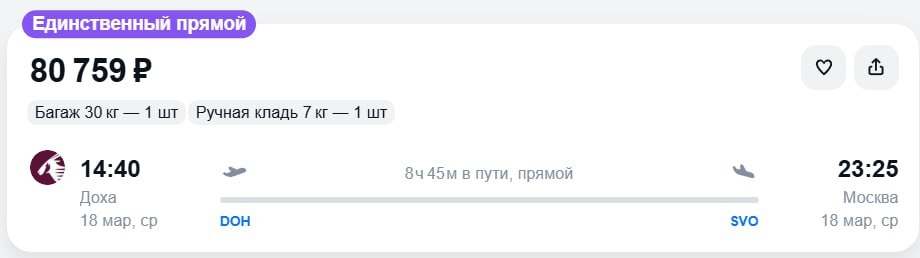 Улететь из Катара можно с 18 марта - билеты от 80 тыс. В обратную сторону первый вылет назначен на 19-е число в 00:55. Тут ценник чуть бюджетнее - от 64 тыс. Как уточнили в Посольстве РФ в Катаре, решение принято авиакомпанией после тщательной оценки нынешней обстановки в регионе. Открыться должны и другие направления. @tourdom