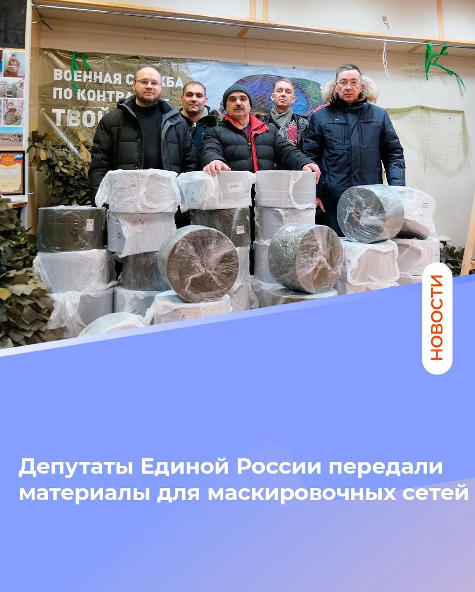 По запросу добровольческого движения «НАО. ZА НАШИХ» депутаты оперативно передали необходимые материалы для помощи фронту Маскировочные сети, созданные руками волонтеров, помогают скрыть технику и позиции от противника, сохраняя жизни военнослужащих. Партийцы рады, что могут закрыть конкретную потребность, озвученную добровольцами, и продолжить эту важную работу в тесном сотрудничестве с добровольческим движением. Депутат Горсовета Виктор Кыркалов поделился: «Это не просто ткань — это вклад в безопасность наших бойцов. Поддержка участников специальной военной операции и их семей остается одним из ключевых приоритетов работы Единой России. Мы видим свою задачу в том, чтобы помощь фронту была не разовой акцией, а системной, непрерывной работой. Важно, что мы действуем в связке с волонтерами: они знают реальные потребности на местах, а мы обладаем возможностью закрыть эти потребности. Такие мероприятия укрепляют тыл и показывают нашим бойцам, что они не одни — за их спинами вся страна, об