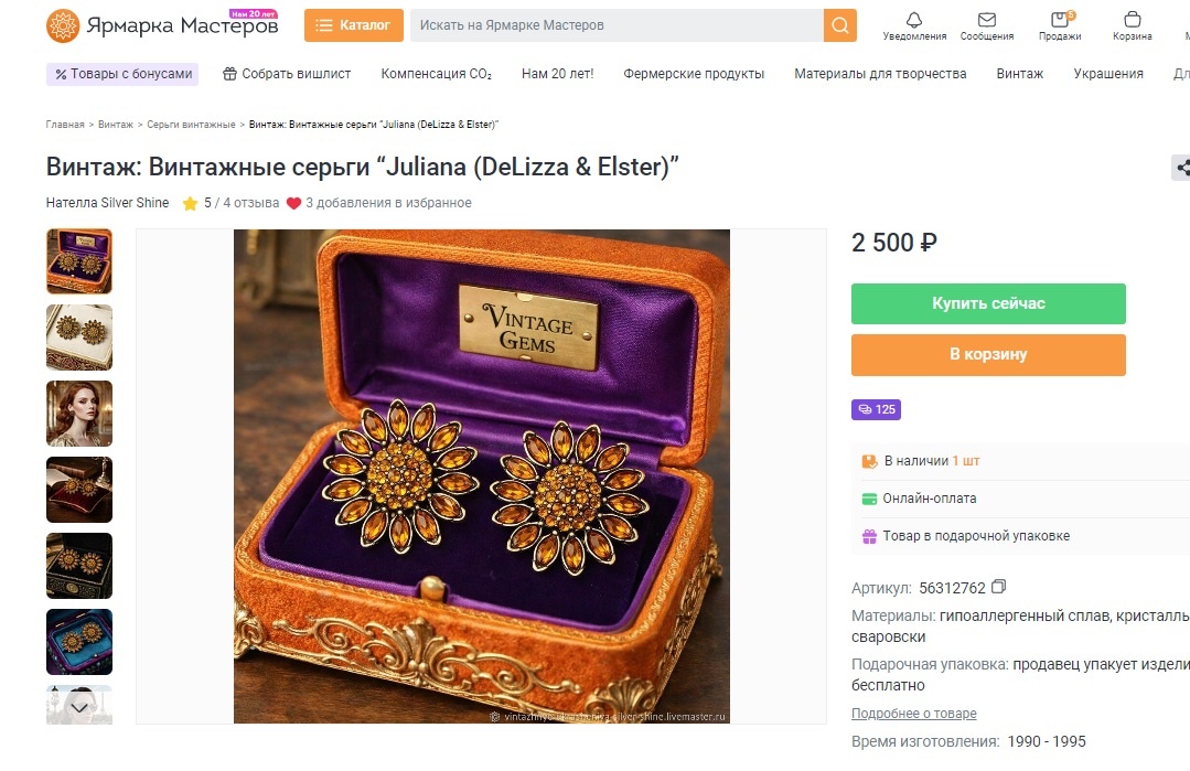 Эпизод 1 На известной торговой площадке продаются серьги. В описании продавца информация - "Винтажные серьги “Juliana (DeLizza & Elster)” . Новые. Серьги американской компании DeLizza & Elster, которая в 1960-х годах выпускала бижутерию под маркой Juliana. Эти изделия отличаются богато инкрустированными стразами, необычным дизайном и сейчас считаются коллекционными винтажными украшениями". Серьги с маркировкой бренда" Рассмотрим серьги ближе. Я позволю себе прокомментировать описание. Годы изготовления обозначены продавцом - 1990-1995. Компания прекратила существование в 1990 году. Juliana - это только линейка украшений, которая выпускалась в течение короткого времени в 1967 - 1968 годах (информация из книги - Art of Julina Jewelry, автор Katerina Musetti). Как маркированы эти серьги, непонятно. Фото маркировки и оборотной стороны продавцом не представлены. На оригинальных украшениях Juliana маркировки не было, но название линейки было на съемных бумажных бирках, большинство из кото