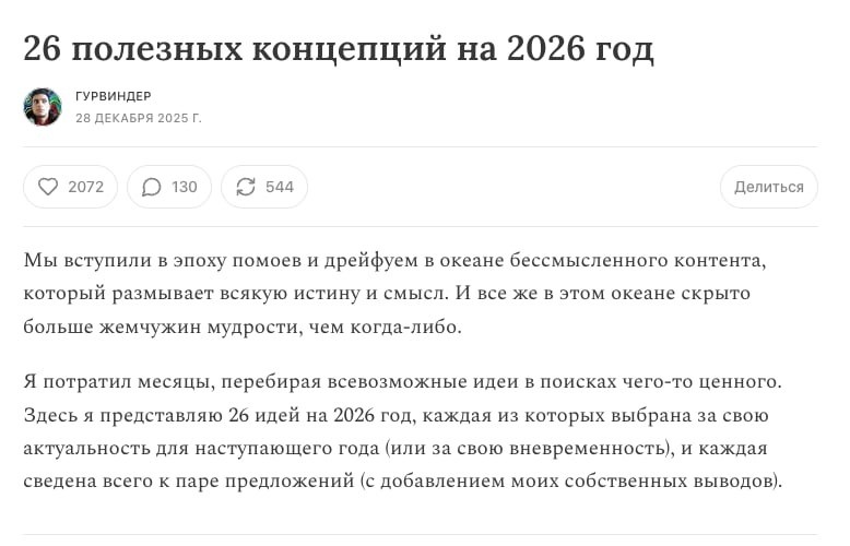 Ладно, минифлешмоб коротких отсылок закончился, переходим к стандартным заметкам. Сегодня смотрим на полезные концепции, собранные хорошим человеком Мы вступили в эпоху помоев и дрейфуем в океане бессмысленного контента, который размывает всякую истину и смысл. И все же в этом океане скрыто больше жемчужин мудрости, чем когда-либо. Я потратил месяцы, перебирая всевозможные идеи в поисках чего-то ценного. Процитирую несколько ▶️ Бритва Каммараты Если вы хотите большей свободы действий, спросите себя, что бы вы сделали, если бы у вас было в десять раз больше свободы действий. А затем сделайте это. ▶️ Парадокс скуки Когда телефон всегда под рукой, заскучать практически невозможно. Это катастрофа, потому что скука — это та грязь, из которой расцветает творчество. Скучать — значит не отвлекаться, и только тогда можно свободно мечтать, так же как только когда мир погружается во тьму, мы видим галактику. ▶️ Тест душа Нас социально запрограммировали гнаться за тем, чего, как нам кажется,