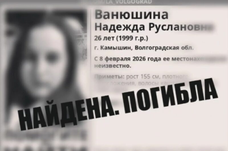 26-летняя жительница Камышина Надежда Ванюшина покинула дом 8 февраля. С 14 февраля она перестала выходить на связь, что стало причиной для обращения родных в полицию. Впоследствии молодая женщина была объявлена пропавшей без вести, её поисками занялись правоохранительные органы и волонтеры поисково-спасательного отряда «Лиза Алерт». Средства массовой информации распространили ориентировки на поиск…