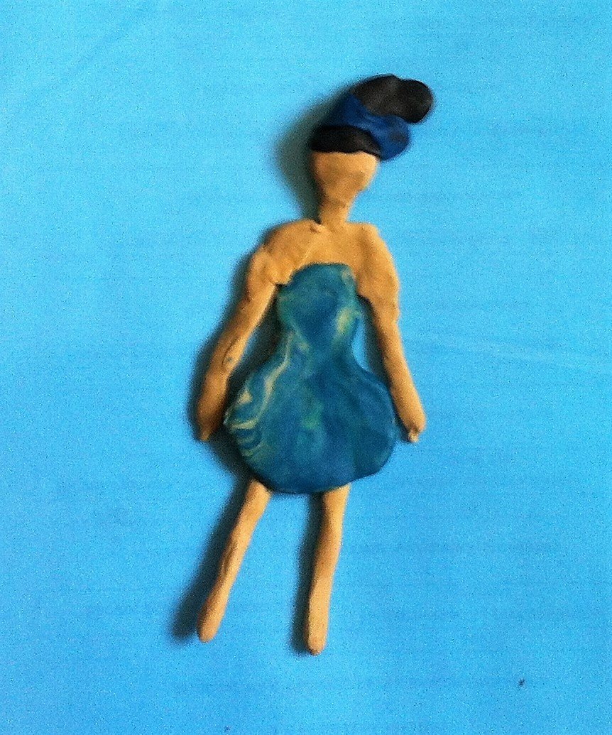На наше отношение к собственному телу влияют как жизненные обстоятельства, так и биологические факторы. Семья, социум и культура обучают нас, как относиться к телу. Человеческая фигура, изображённая на рисунке или вылепленная, может дать заинтересованному наблюдателю немало информации. В изображении можно увидеть: ранние травмы, желания и страхи, психологические защиты и многое что еще. Ниже приводится пример работы с клиенткой. В работе использован пластилин. Пример из практики. От клиентки получено разрешение на публикацию, имя изменено. Таисья – молодая девушка, она считает, что «никому не нужна». Так и относится к себе, как к «никому не нужному человеку». Девушке очень хочется почувствовать себя иначе – «принцессой». Предлагаю Таисье вылепить себя принцессой. Девушка начинает лепку принцессы с головы, приговаривая: «Голова есть. Это самое главное». Многие люди, как и Таисья, считают голову главной частью своего тела. Без контроля и мыслительной работы у них возникает чувство опасно