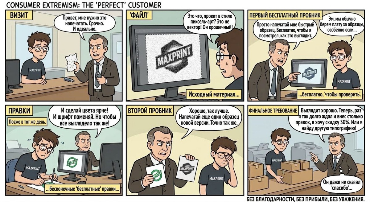 Потребительский экстремизм в дизайне и производстве : «Сделайте бесплатно, быстро и со скидкой» В сфере услуг есть категория клиентов, после общения с которыми хочется не прибыли, а уйти в бессрочный отпуск в горы. Мы привыкли называть это «сложным заказчиком», но давайте называть вещи своими именами: перед нами потребительский экстремизм. Особенно ярко он проявляется в сегменте производства — там, где работа дизайнера и печатника часто обесценивается фразой «вам же несложно нажать пару кнопок». Анатомия типичного кейса Сценарий всегда развивается по одной схеме. Если вы узнаете в этом описании своего клиента — включайте режим «красного флага». - «Сырой» исходник. Клиент приносит логотип, вырезанный скриншотом из мессенджера, или фото , снятое на старый тапок. На просьбу прислать вектор следует ответ: «У меня только это, сделайте как-нибудь». - Бесплатные образцы. «А напечатайте мне пробник, я посмотрю». Вы тратите время мастера, краску, бумагу или материал. - Бесконечные правки «в сче