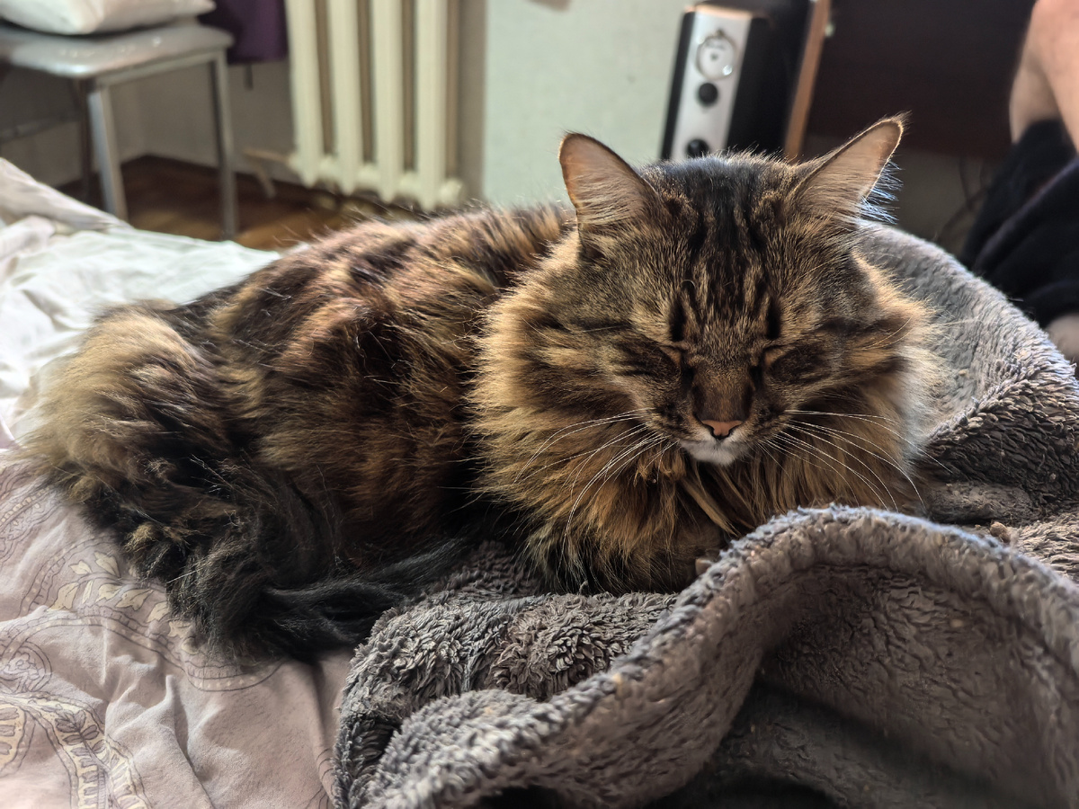 Людишки мои опять проснулись уже после 8 часов утра. Хозяин сделал всем кофе (кроме меня, конечно, я такое не ем и не пью). Людишки лежали в кровати, а я решил устроить тыгыдык по квартире. Потом присоединился к хозяевам, полежали немного, я даже халат месил. Потом хозяин переместился за компьютер, ну а мне сделал вот такое гнездо из халата: