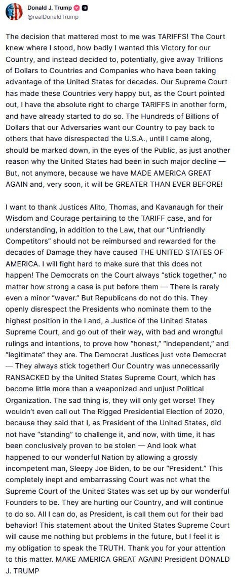 TRUMP PENS EXTREMELY LONG NEGATIVE POST ON TARIFFS Says Court giving away 'TRILLIONS' to foreign countries, demanding 'HUNDREDS OF BILLIONS' be paid to those 'WHO DISRESPECTED THE US' 'THEY ARE HURTING THIS COUNTRY!'