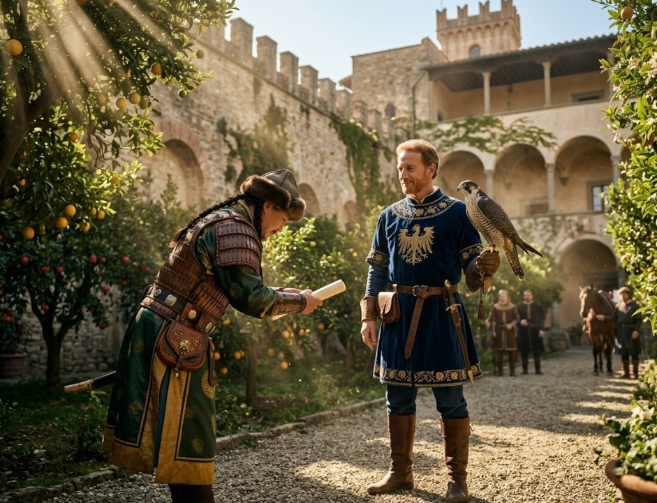 В 1238 году в полевом лагере императора Священной Римской империи Фридриха II в Ломбардии произошло удивительное дипломатическое событие. Послы доставили могущественному монарху письмо от предводителя монгольской армии Батыя с ультиматумом: добровольно подчиниться и стать вассалом Великой империи. Ответ Фридриха II навсегда вошел в историю своей изящной дерзостью. Правитель отшутился, что с большой радостью признает великого хана своим сюзереном, но при одном скромном условии — если тот назначит его главным сокольничим, поскольку император знает толк в хищных птицах.