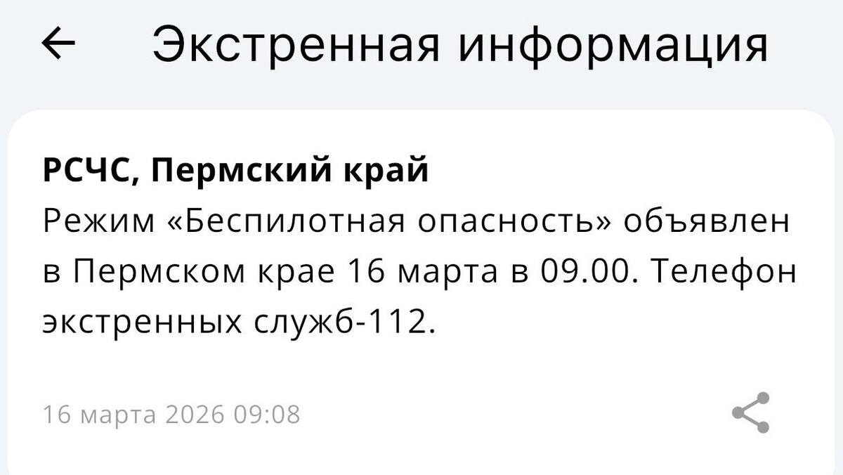 Профильные службы — в полной готовности, сообщили в министерстве территориальной безопасности Пермского края. Прикамцев простят доверять только официальным данным и не паниковать. Номер вызова экстренных служб — 112. UPD: 12:08 Режим «Беспилотная опасность» снят. Подписывайтесь на нас в Telegram и Max!