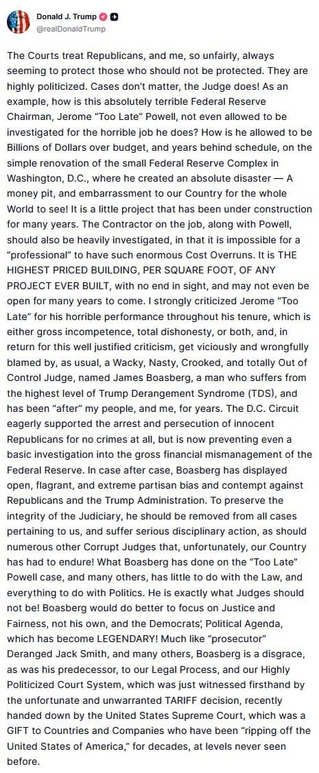 Court treats Republicans 'UNFAIRLY', blames judges — including Jerome 'TOO LATE' Powell — for 'HORRIBLE JOBS', says should be removed from cases 'INVOLVING US' 'EMBARRASSMENT TO OUR COUNTRY & THE WORLD!'