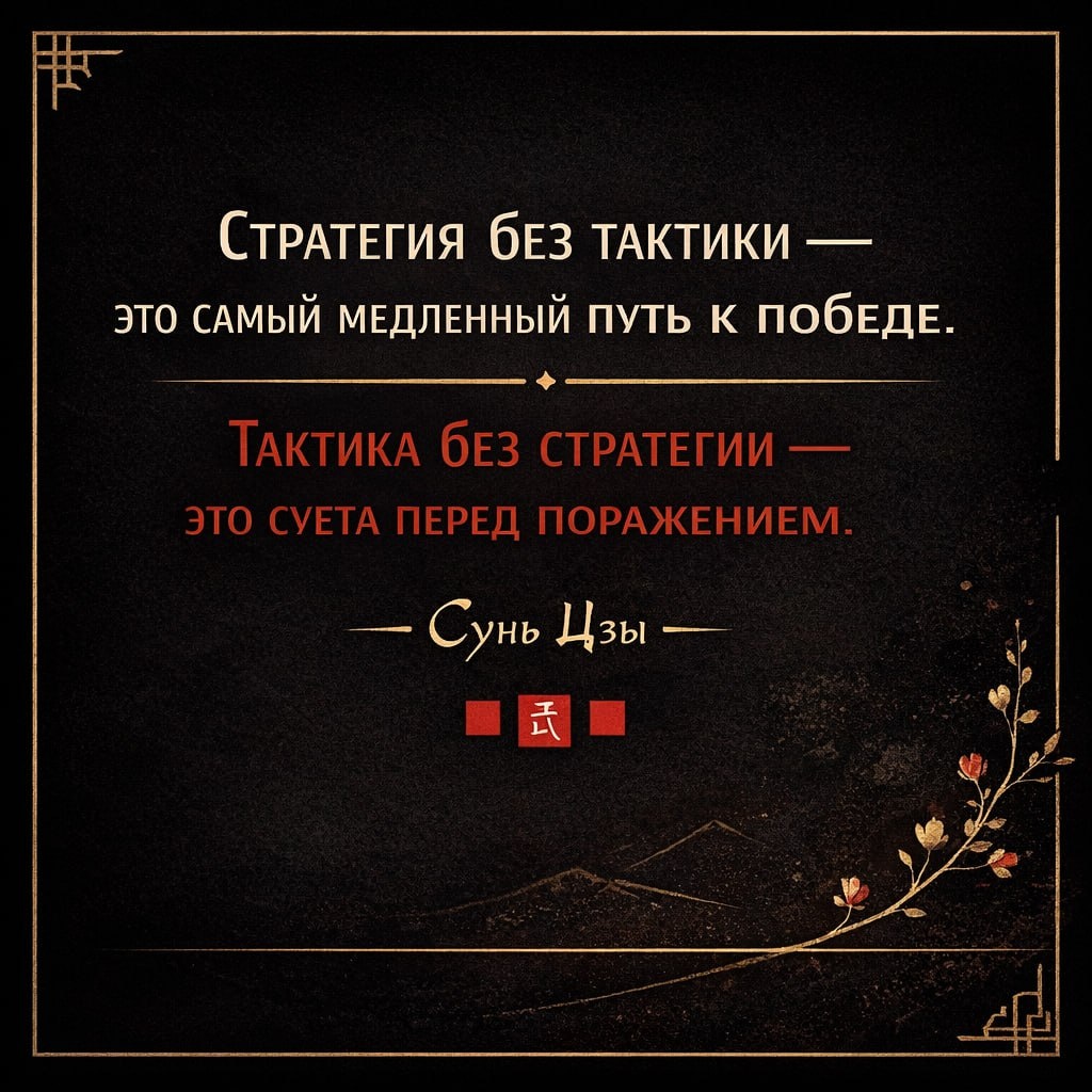 И ни на миллиметр не продвинуться в СВОЮ жизнь. «Стратегия без тактики - самый медленный путь к победе. Тактика без стратегии - это суета перед поражением». Сунь-цзы. Мысль в яблочко! 100500 чатов, 48 задач, на фасаде «я очень важный человек», а внутри: «Когда я уже займусь тем, что мне правда важно, а не вот этим всем?» Потому что стратегия - это понимать, куда ты идёшь и зачем тебе туда. А тактика - что ты делаешь сегодня, на этой неделе, в этом месяце, чтобы туда прийти. Например: Вы хотите за год сменить работу на ту, где больше смысла, денег и жизни - стратегия. А тактика: не лежать королем (королевой) замысла, а обновить резюме, сделать новое портфолио, написать 5 людям, откликнуться на 30 вакансии, пройти курс, который закрывает дыру в навыках... А вот как выглядит тактика без стратегии на ту же тему: Человек тоже хочет сменить работу. Очень хочет. Уже почти энергетически уволился. Но по факту: пересадил фикус, сходил на красивую лекцию “про предназначение”, выбрал н