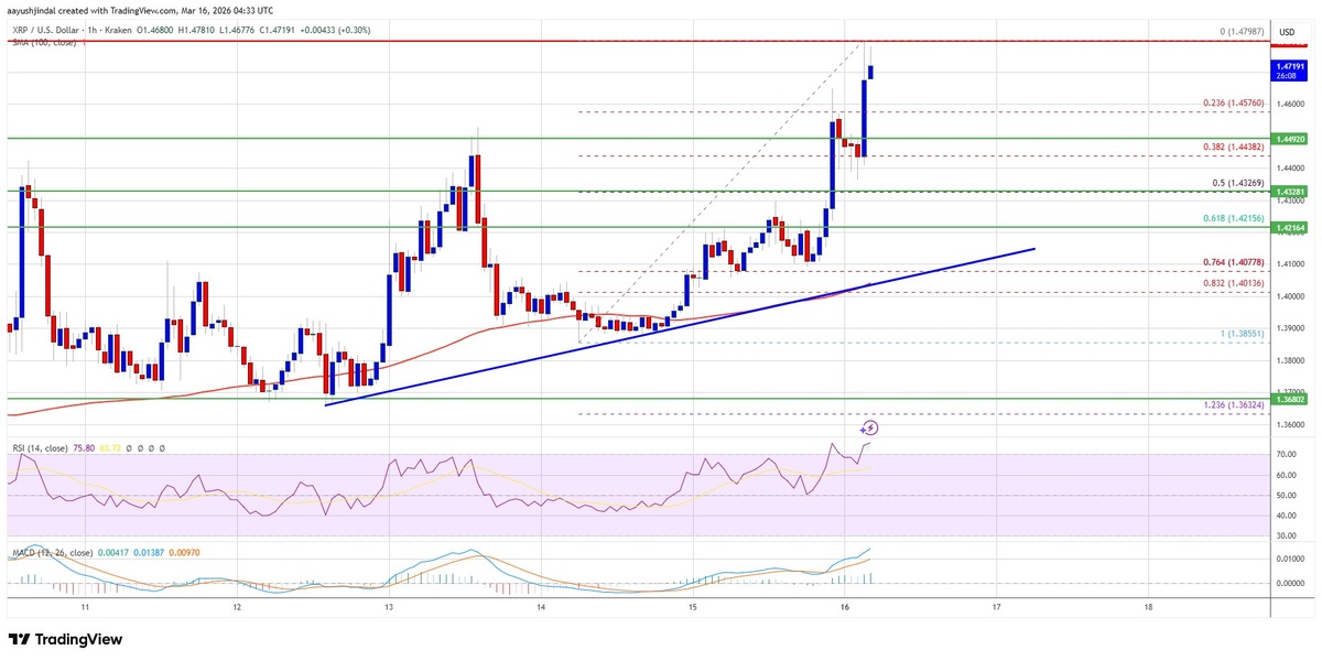 ? Цена XRP значительно выросла, превысив отметку в $1.450, и сейчас консолидируется, нацеливаясь на дальнейший рост выше $1.480. Эта динамика отражает общую тенденцию рынка, наблюдаемую у Bitcoin и Ethereum. Ключевым моментом для продолжения роста станет прорыв уровня $1.50. 📊 Ключевые моменты: - XRP торгуется выше $1.4550 и 100-часовой простой скользящей средней. - Формируется бычья линия тренда с поддержкой на $1.410. - Основные сопротивления: $1.480, $1.50, $1.5250, $1.5320 и $1.550. - Поддержки: $1.450, $1.4325 (50% Фибо) и $1.410. - Индикаторы: MACD и RSI находятся в бычьей зоне. ⚠️ Риски: Если XRP не сможет пробить сопротивление на $1.480, возможно снижение до $1.450 и $1.4325. Горизонт: краткосрочно