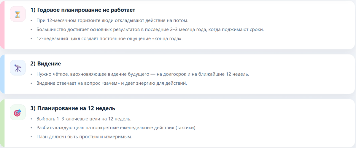 Каждую неделю я провожу короткую сверку: что сделано из плана, что не сделано и почему. Я это делаю, чтобы видеть реальную картину. Это похоже на то, как встать на весы: не всегда приятно, но зато точно знаешь, где находишься. Такая честность перед собой убирает самообман, а это главный враг любого плана. Не лень, не нехватка времени, а “ну вроде нормально поработала”, когда на самом деле половину дня потратила непонятно на что.