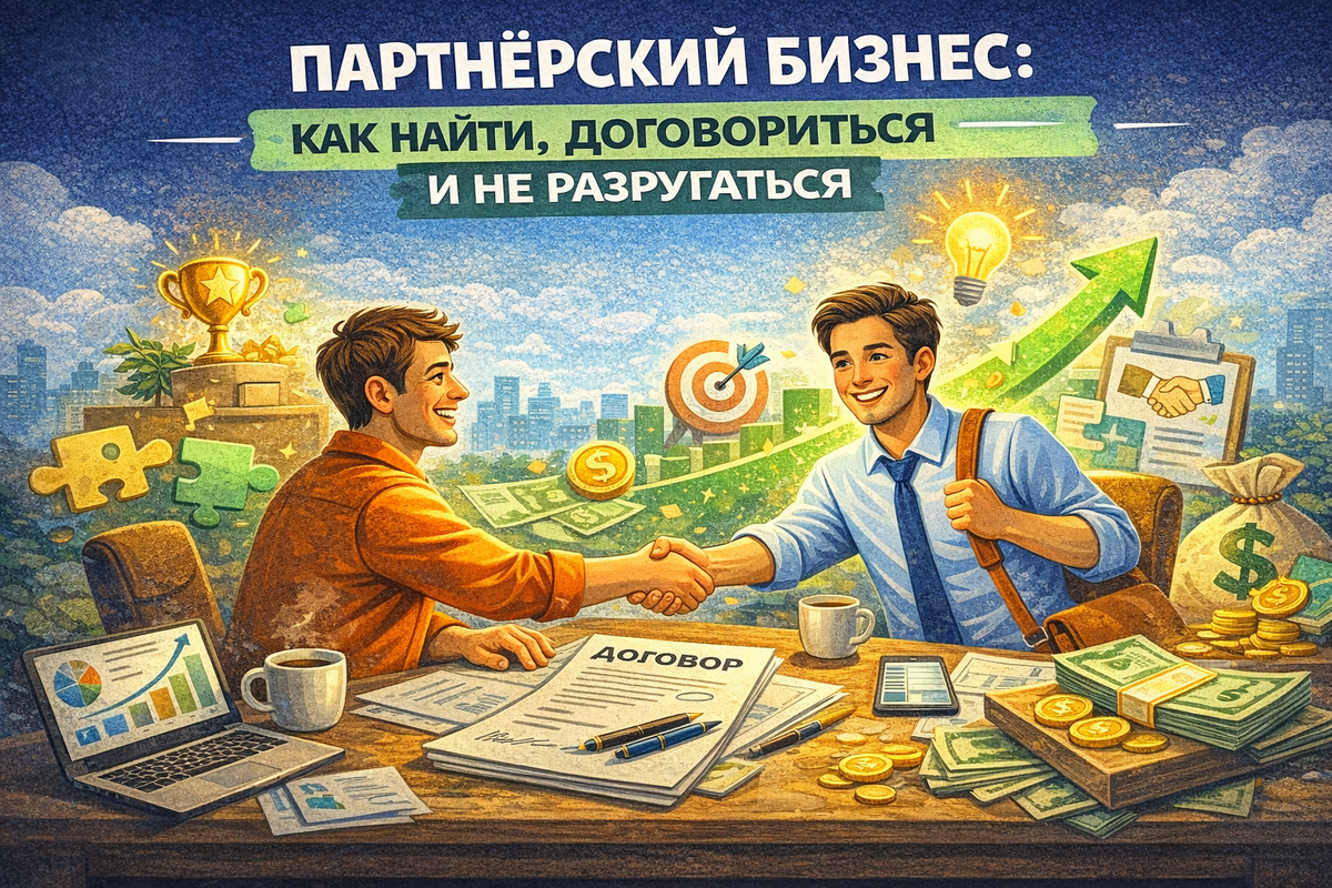 Привет. Сегодня поговорим, как строится партнёрский бизнес, где искать партнёров, как делить обязанности и какие есть плюсы и минусы такого формата сотрудничества.