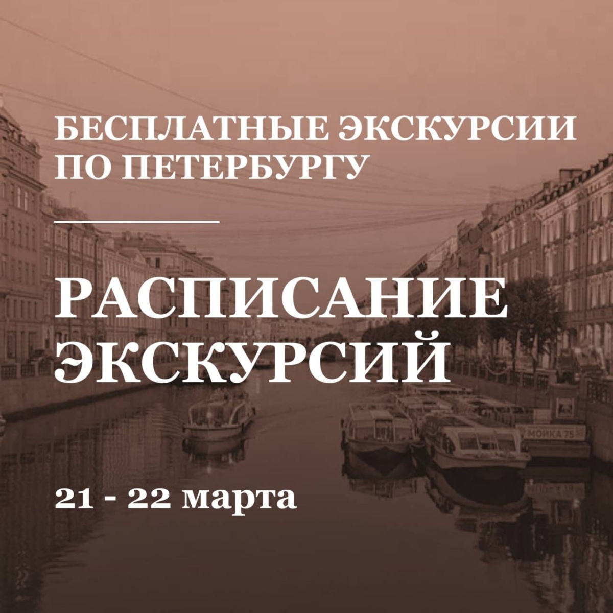 : 🚶🏼♂️➡️ПЕШИЕ ЭКСКУРСИИ: Запись — > https://clck.ru/3SYpm4 🔖21 марта (суббота) ⭐️Бесплатные: 11:00 — 12:30 "Католики и протестанты на Невском" 12:00 — 14:00 "Жизнь и смерть русского Гамлета. Бедный, бедный Павел…" 12:00 — 14:00 "Между цветными мостами" 12:00 — 14:00 Премьера! "Возрожденная обитель и утраченные церкви в центральном районе города" 13:00 — 14:10 "Под сводами Никольского собора: история, вера, судьбы" 13:00 — 15:00 "Дома и люди улицы Марата" 13:00 — 14:30 "Человеки улицы Бассейной" 14:00 — 15:40 "Дворы Литейного" 15:00 — 16:30 "Прогулка по Пушкинской улице, как влюбиться в улицу с первого взгляда" 15:00 — 16:30 "Дворы от Сенной до Никольского" 15:30 — 17:30 "Святыни Большого Сампсониевского" 16:00 — 18:00 "Исаакиевский собор — северное чудо Монферрана" 💰Платные: 11:30 — 12:45 "Особняк Матильды Кшесинской" 12:00 — 14:00 "Cоветское противоатомное бомбоубежище" 🔖22 марта (воскресенье) ⭐️Бесплатные: 12:00 — 14:00 "Герои или злодеи: две стороны одного мятежа" 12:00 —