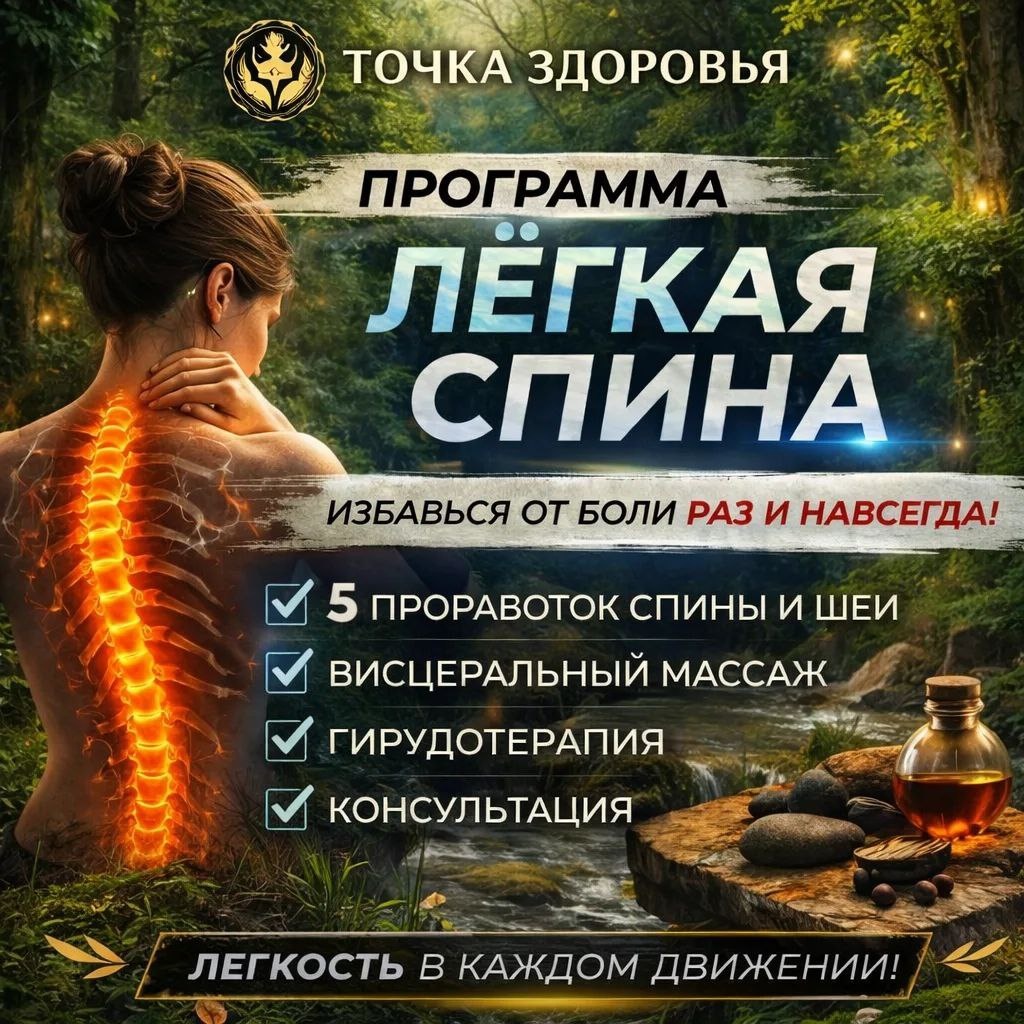 Часто мы ищем волшебную таблетку: «Разотрите меня, чтобы полегчало». Но временное облегчение от массажа сменяется привычным дискомфортом. Чтобы убрать боль навсегда (или на очень долгий срок), нужно убрать её причину. Вот что реально работает — программа «ЛЁГКАЯ СПИНА»: 📌 Этап 1. Глубокая миофасциальная проработка 5 сеансов снимают даже застарелые мышечные спазмы. Вы почувствуете, как уходит «деревянность». 📌 Этап 2. Висцеральный массаж Внутренние органы могут «тянуть» позвоночник. Возвращаем им свободу — убираем рефлекторную боль в спине. 📌 Этап 3. Гирудотерапия Снимаем отек и запускаем кровоток вглубь тканей, чтобы убрать воспалительный процесс. 📌 Этап 4. План на будущее Вы получаете консультацию и четкие рекомендации, чтобы результат закрепился. ‼️После программы уходит тяжесть, уходит скованность. Появляется та самая желанная ЛЕГКОСТЬ. 💬 Напишите «СПИНА» прямо сейчас, и я пришлю вам подробности. #легкаяспина #здоровьеспины #хроническаяболь #висцеральныймассаж #гирудоте