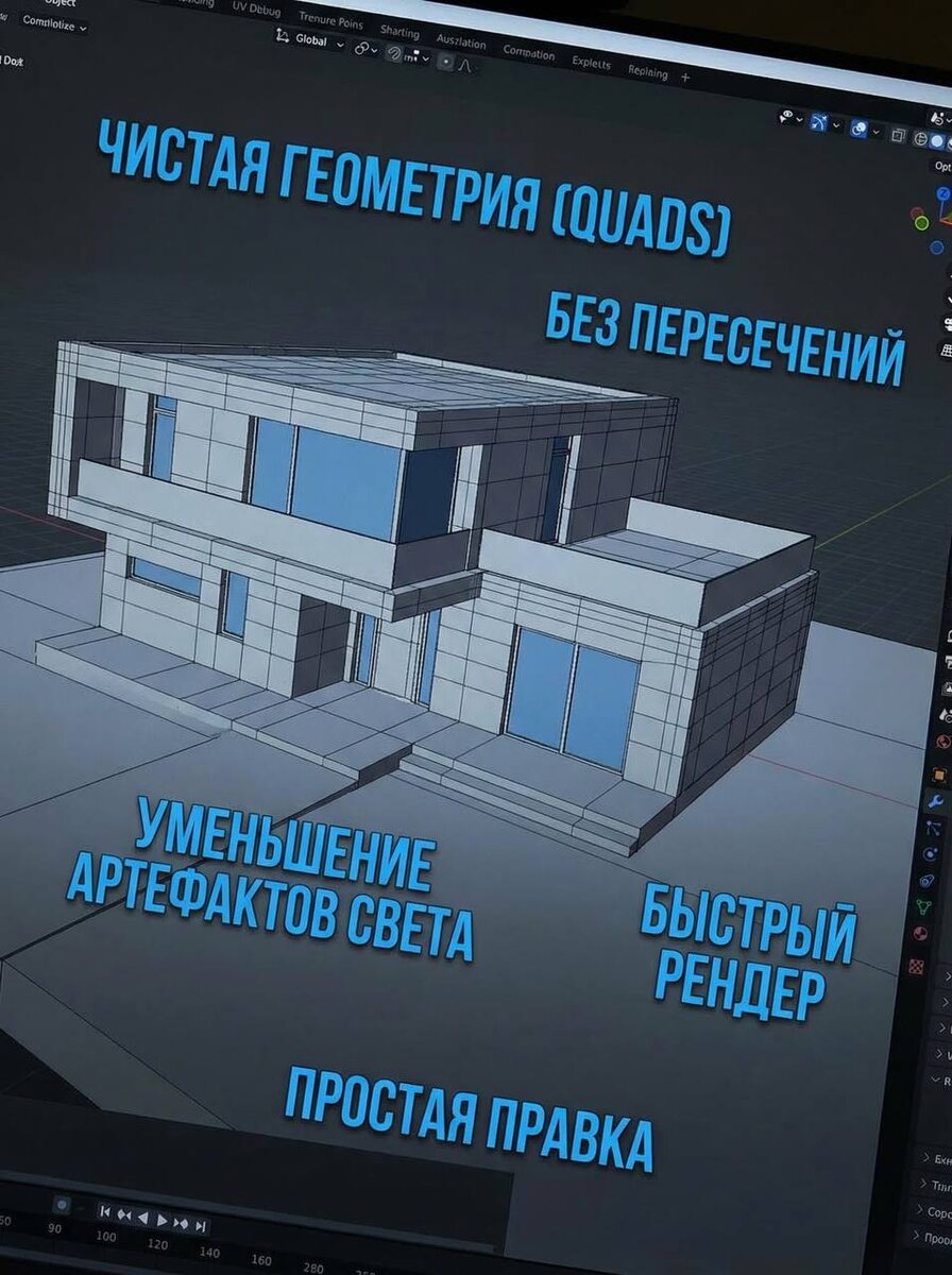 1. Чистая и логичная геометрия Модель должна состоять из понятной, читаемой геометрии, без мусора. Ключевые правила: избегать n-gons (многоугольников с большим количеством сторон) не оставлять пересекающиеся полигоны удалять скрытые внутренние полигоны использовать quads и разумную триангуляцию Почему это критично: ускоряет рендер уменьшает артефакты света облегчает правки сцены 2. Работа в реальном масштабе Архитектура всегда моделируется в реальных размерах. Стандарт: System Units → millimeters Display Units → meters Ошибки масштаба приводят к: неправильному поведению света некорректному displacement проблемам с прокси и скаттером 3. Правильная иерархия сцены Сцена должна быть структурирована как архитектурный проект, а не как хаос из объектов. Пример структуры: BUILDING facade glazing roof SITE roads landscape street furniture ASSETS people cars vegetation Это позволяет: быстро изолировать элементы ускорить правки работать в команде 4. Минимум геометрии — максимум формы Одна из