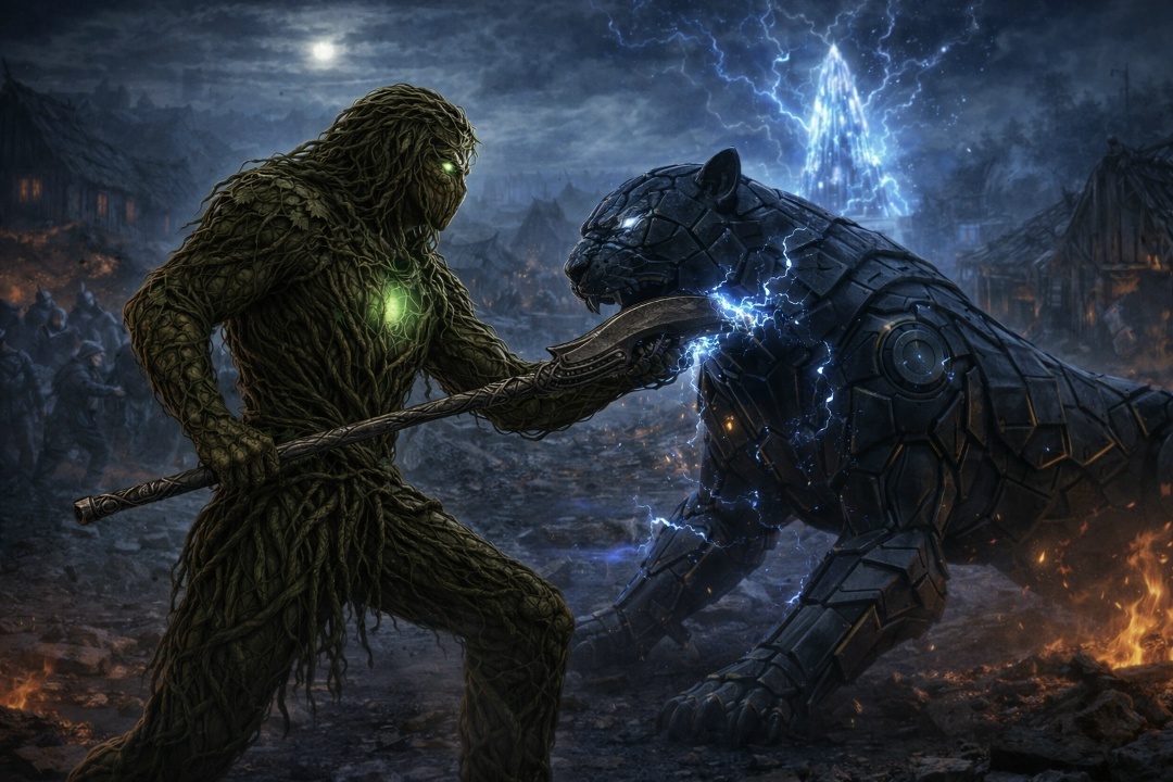 Элвин кивнул, но в следующем просвете снова увидел Корна и просто не смог оторвать взгляда от происходящего. Тот стоял почти вплотную к ягуару. В одно мгновение он с такой силой всадил наконечник оружия под край грудной пластины, что та с треском отошла вверх, как сорванная крышка. Под бронёй блеснул яркий синеватый свет. Кошка рванулась, хотела ударить Корна лапой, но тот уже перехватил оружие и коротким, точным движением вогнал острие под вскрытую пластину. Раздался сухой металлический хруст. По зверю пробежала голубая судорога; он вскинул голову, раскрыл пасть, из последних сил пытаясь вцепиться в Корна. В ту же минуту несколько копий с боков ударили ягуара в шею и в суставы. Кошка, дёрнулась, и тут же повалилась набок всем своим тяжёлым корпусом.