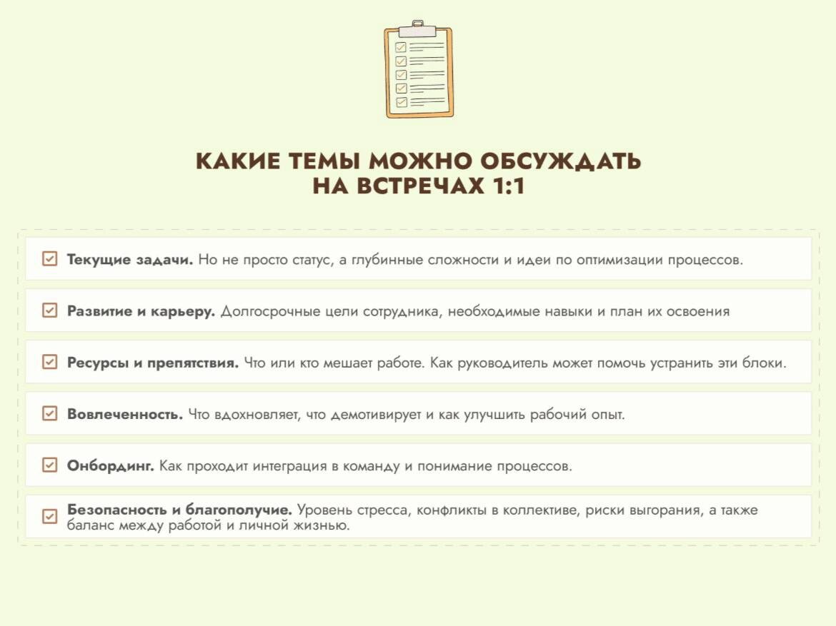 Я проводила встречи 1:1 с сотрудниками во всех крупных компаниях где работала. Раз в две недели, час, иногда чуть больше. Это была обычная практика в больших устоявшихся структурах. Но когда я вижу малый и средний бизнес такого почти нет. А зря. Что происходило на этих встречах: я спрашивала человека о нём. Что хочет, как видит свою работу, что мешает, что было бы лучше. Слушала. Давала обратную связь -честную, но без унижений. Результат был каждый раз одинаковый: мотивация росла, люди начинали генерить идеи сами, искали возможности для своего развития, приходили с предложениями. Не потому что их заставляли. А потому что их услышали. Как принято сейчас говорить: «человеку нужен человек». Как выглядит встреча? Вот ее структура: Открытие - 5 минут. Один вопрос: что сейчас занимает больше всего головы? Не светская беседа - калибровка состояния человека. Его повестка - 15-20 минут. Сначала говорит топ. Что застряло, где нужно решение, где нужен ресурс. Руководитель слушает - не пере