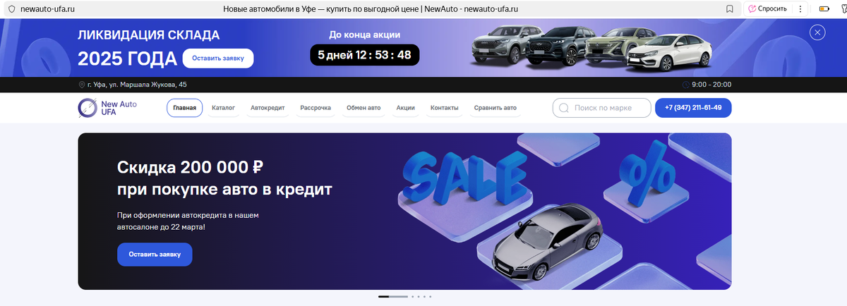 New Auto Ufa — это автосалон в Уфе. Занимается продажей новых автомобилей. В работе дилера обнаружены подозрительные моменты. Больше интересного — в нашем обзоре. В автосалоне на Маршала Жукова 45 в Уфе можно купить новый автомобиль. По крайней мере, так указано на сайте, который активно «крутится» в рекламе. Однако по данному адресу находится автосалон, в котором продаются авто с пробегом, — Plaza. На основании этого, к салону, сайт которого сейчас активно продвигается, у нас есть большие вопросы. Поэтому мы решили провести проверку. Владельцем автоцентра New Auto Ufa является ООО "АВТОЛИДЕР 116" (ИНН: 5609203912). Компания зарегистрирована в 2023 году в Оренбурге. Среднесписочная численность сотрудников — 1 человек. Есть налоговая задолженность. Владелец дилерского центра New Auto Ufa не числится в реестре судебных дел о защите прав потребителей. Возможно, это из-за того, что фирма указывается в качестве владельца только на сайте, а не в документах о покупке авто. Об автосалоне