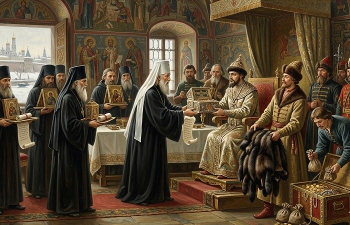 В Московское государство со всех уголков Востока потянулись христиане с подношениями, получая за них щедрую плату. Так, в XVI веке сформировался постоянный и весьма прибыльный обмен святынь на деньги и драгоценные соболиные меха.