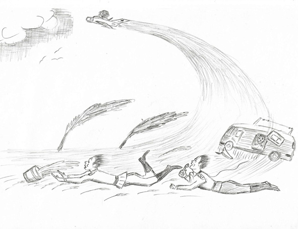 -Ложись!- указывая в ту сторону откуда пришёл самолёт. Оттуда стремительно мчался шквал от реактивной струи. Кондрат успел с кружкой молока брякнуться на пузо, заметив, что на него летит ведро с молоком опрокидываясь в полёте. Потом он, захлёбываясь в молоке, ощутил, что потерял власть над телом – оно тряслось и колотилось об землю. Шквал прошёл стремительно, как и начался. Майор и радист Ваха, встав на ноги ощупали дверцу УАЗика, повисшую после шквала на одной нижней петле. Майор поднял в траве микрофон и, глядя вслед вертящемуся в «бочке» самолёту, сказал: