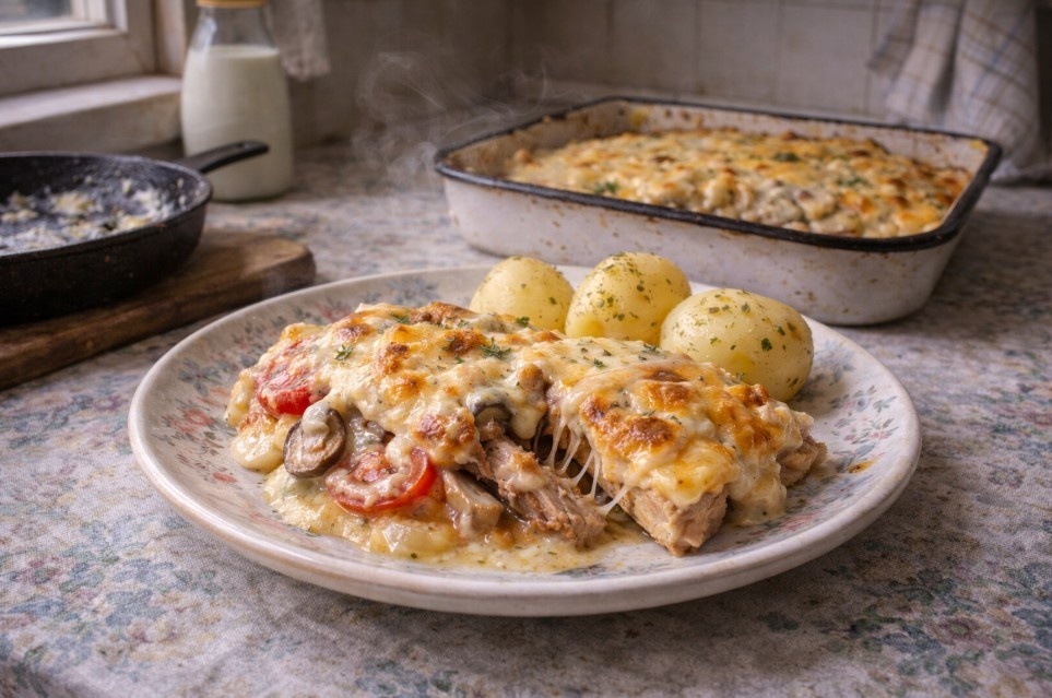 Когда я впервые произнесла «бешамель», Володя поднял бровь: «Галя, мы что, во Францию переехали?» А я ему: «Сиди и жди, сейчас всё поймёшь». Понял. Добавки попросил. Шестьсот граммов свиной вырезки нарезаю кусками — как рука ведёт, не мельчу. Выкладываю в форму для запекания, солю, перчу. Сверху — две луковицы полукольцами. Теперь соус. В чугунной сковороде на медленном огне растапливаю сто граммов сливочного масла. Три столовые ложки муки с горкой — туда, и мешаю, пока не разойдутся все комочки. Потом тонкой струйкой вливаю шестьсот-семьсот миллилитров молока, солю, перчу, пару щепоток мускатного ореха. Помешиваю, пока не загустеет — нужна консистенция нежирной сметаны. Мама говорила: «Хороший соус — душа блюда». Права была. Третью соуса поливаю мясо с луком. Триста граммов шампиньонов нарезаю, выкладываю следующим слоем, ещё треть соуса. Два помидора — произвольно, сверху, и остатки соуса. Посыпаю ста граммами тёртого сыра. В духовку на сто восемьдесят градусов, сорок пять — пятьдеся