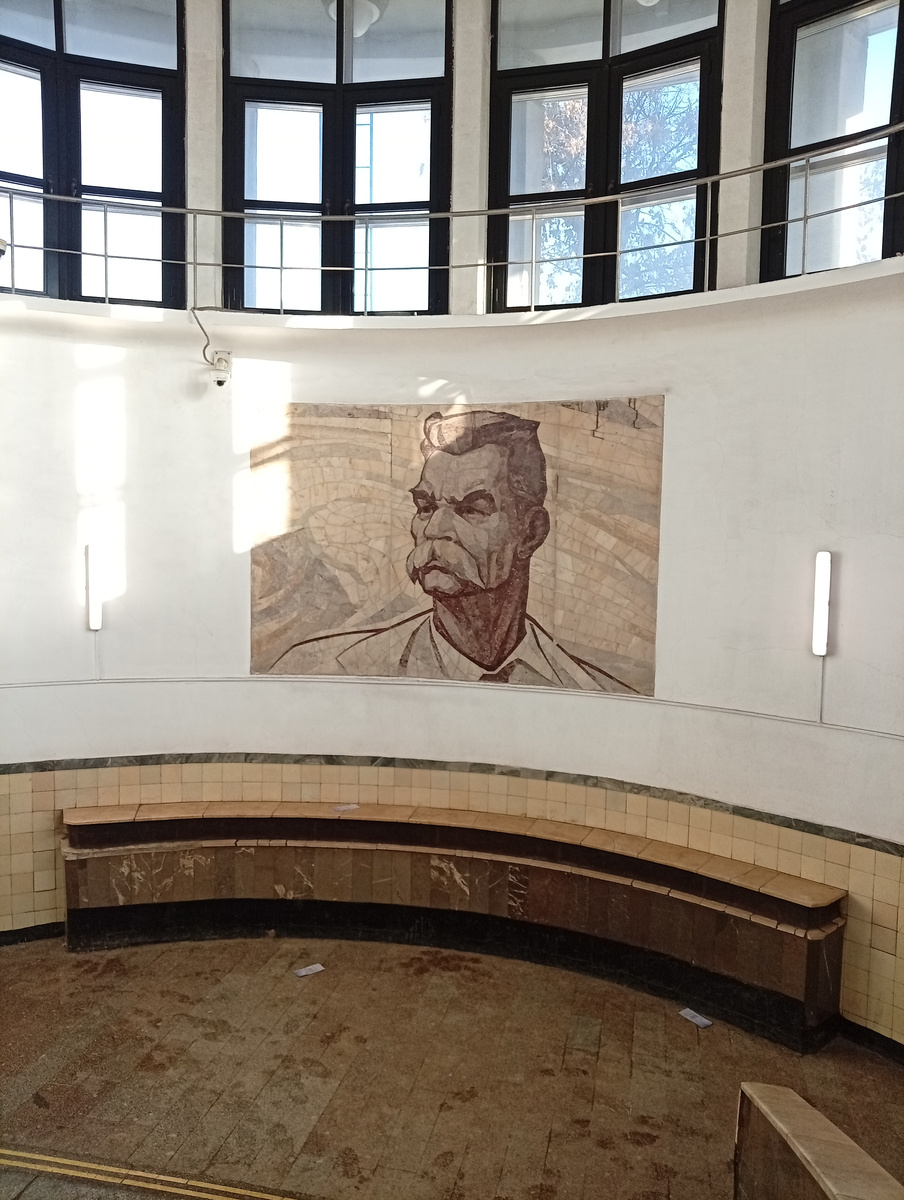 Вышла на метро "Парк Культуры" радиальная. Все было нормально, но на выходе зацепилась взглядом за мозаичный портрет Максима Горького. Люблю мозаичное, а мозг всегда любимое ищет и замечает. Эта флорентийская мозаика создана в 1960-х Л. М. Рябовым, учеником Павла Корина, по написанному им в 1930-х портрету. Почему она здесь - понятия не имею. Если знаете больше, пишите в комментариях, уничтожим вместе лакуны знаний.