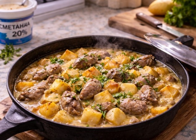 Куриные сердечки долго обходили меня стороной. Лежат на прилавке — мелкие, тёмные, непонятные. А потом соседка Валентина угостила жарким, и я пропала. Выпытала рецепт прямо на лестничной клетке, стоя в тапках. Триста граммов сердечек разрезаю каждое пополам, вычищаю сгустки, промываю под краном. На сковородку — пару ложек растительного масла, и сердечки туда, на живой огонь. Жарю, пока не зарумянятся, не тороплюсь. Пятьсот граммов картошки чищу и крошу некрупным кубиком. Забрасываю прямо к сердечкам, накрываю крышкой — пускай вместе доходят до полуготовности. А дальше — самое вкусное. Одну луковицу мельчу, морковку тоже, и отправляю в сковороду. Туда же три столовых ложки сметаны — она обнимает всё сливочным облаком. Сыплю соль, чёрный перец по настроению и чайную ложку прованских трав. Вот эти травки — моё открытие. Раньше и слова такого не слышала, а теперь без них никуда. Перемешиваю, крышкой прикрываю и на тихом огне довожу картошку до полной мягкости. Володя, когда впервые попробо
