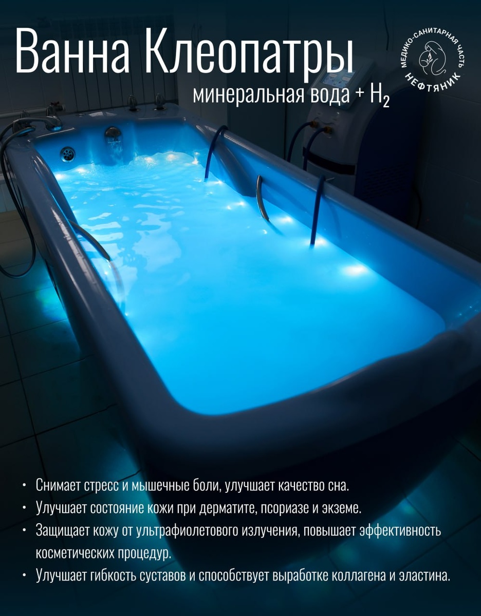 Если к вечеру вы чувствуете тяжесть, мышечное напряжение и усталость, которая не проходит даже после горячего душа или сна, организму нужен не просто отдых. Требуется полноценное восстановление. В поликлинике МСЧ «Нефтяник» для этого есть процедура «Ванна Клеопатры», которая оказывает двойной эффект за счёт сочетания минеральной воды и водорода. Во время процедуры минеральная вода из собственной скважины насыщается молекулярным водородом, мощнейшим антиоксидантом. ✅Водород проникает глубоко в ткани, помогает снизить выраженность окислительного стресса, поддерживает клеточный обмен и буквально «выключает» режим усталости. ✅Минералы закрепляют эффект, делая кожу бархатной, а сон – глубоким и спокойным. Процедура длится 20 минут. За это время тело успевает переключиться из режима постоянного напряжения в режим восстановления. После сеанса многие отмечают, что становится легче физически, уходит чувство разбитости, улучшается сон и появляется ощущение, что сил и энергии стало больше. «В