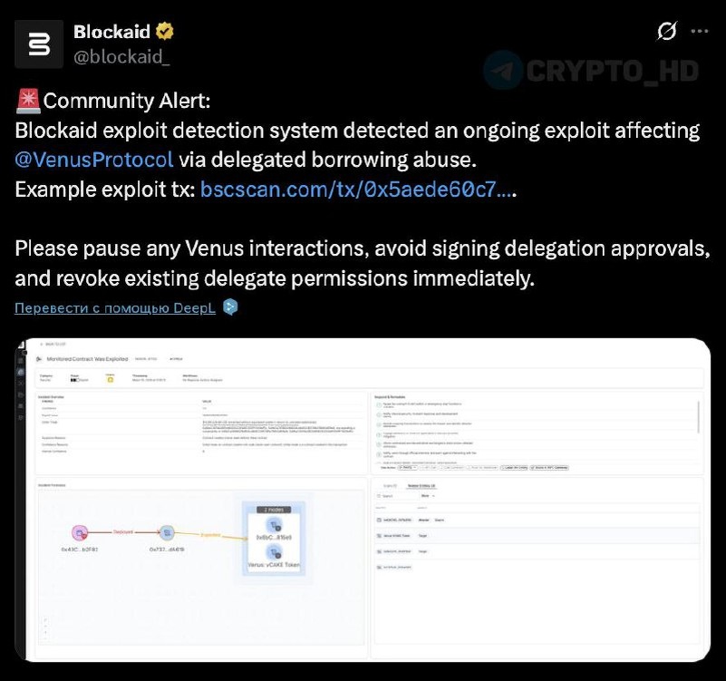 ❌ DeFi-протокол Venus подвергся атаке через флеш-кредит (blockaid) ➠ Злоумышленник искусственно запампил низколиквидный токен #THE. ➠ Затем внес миллионы THE в качестве залога, который из-за завышенной цены протокол оценил в несколько миллионов долларов. ➠ Под этот залог он занял активы из протокола и вывел ~$3,7m (~20 #BTC, 1,5m #CAKE и 200 #BNB). ➠ После завершения манипуляции цена THE рухнула, начались ликвидации, и у протокола образовалась задолженность ~$2m. Crypto Headlines