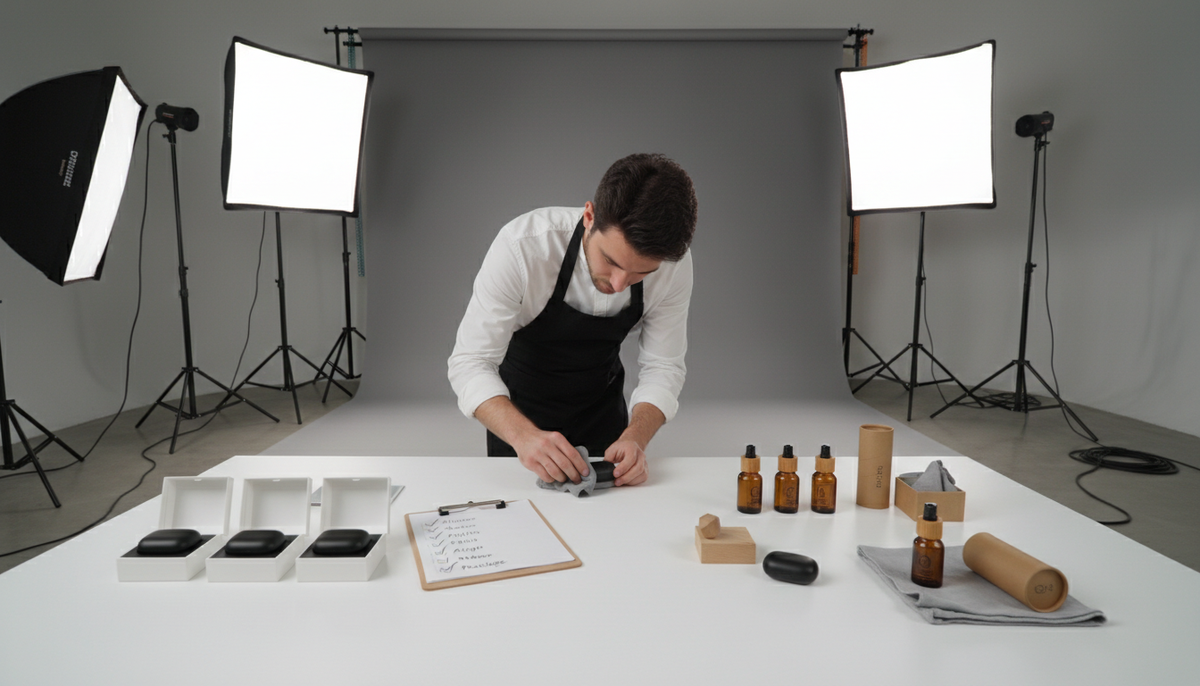 Качественная съёмка начинается задолго до того, как включается камера. Даже самый опытный фотограф не сможет сделать сильный кадр, если товар не подготовлен. Поэтому правильная подготовка — это половина успеха. Особенно если речь идёт о предметной съёмке для маркетплейсов, интернет-магазинов и рекламы. Разберём практические шаги, которые помогут бренду получить максимум от профессиональной фотосессии товара. Первое правило — товар должен выглядеть идеально. Перед съёмкой важно проверить: Если продукт новый, его нужно аккуратно распаковать, чтобы не оставить следов. Для предметной фотосъёмки важна каждая деталь, потому что камера видит больше, чем глаз. Перед передачей товара в студию его нужно тщательно очистить. Пыль, отпечатки пальцев и мелкие царапины становятся заметны при хорошем освещении. Особенно это важно для: Чистый товар выглядит дороже и аккуратнее, а значит повышает доверие покупателей. Иногда во время съёмки могут потребоваться дополнительные ракурсы или повторные кадры.