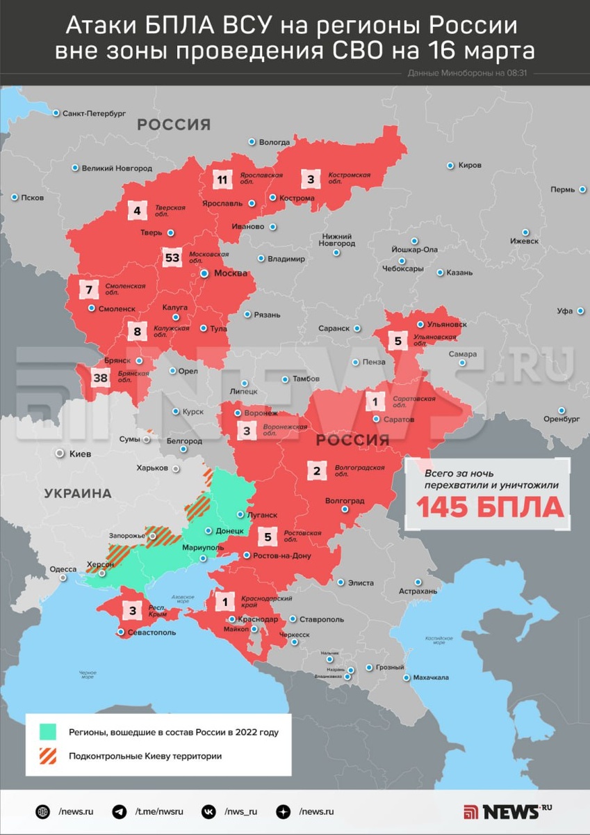53 БПЛА уничтожили над Московским регионом, 38 — над Брянской областью, 11 — над Ярославской, восемь — над Калужской, семь — над Смоленской, по пять — над Ростовской и Ульяновской областями. Подробнее — в нашей инфографике. ⭕️ Подписаться | Мы в MAX | Буст