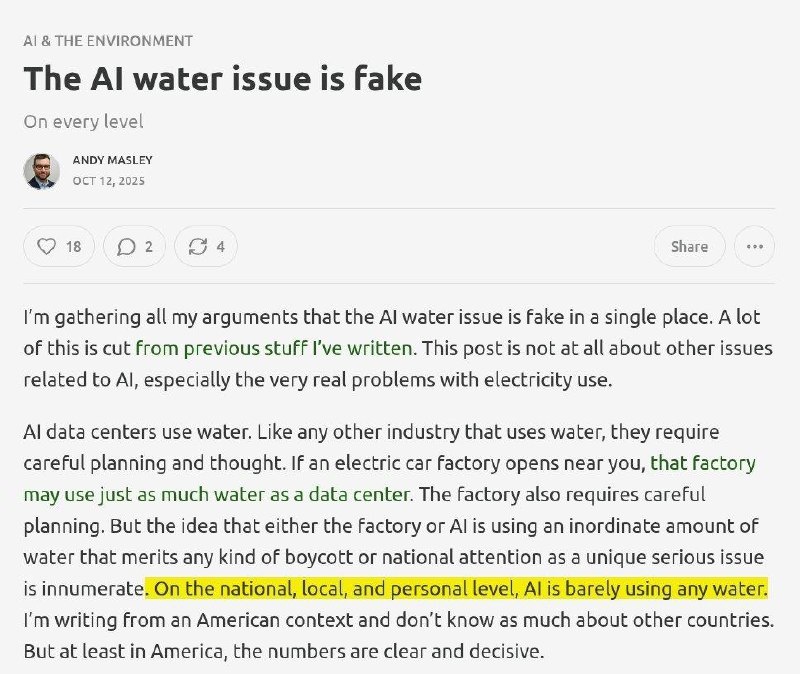 💧 Много разговоров о «водном кризисе из-за AI», но цифры показывают совсем другую картину