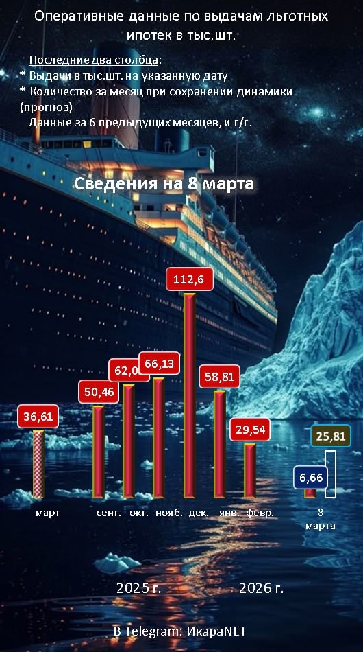 Оперативные данные по льготным ипотекам на 8 марта. Три шестерки (столько выдали в тысячах на это число) — плохой знак. Если все так же будет продолжаться, то март (31 день) по результатам окажется хуже февраля (28 дней), и намного хуже прошлого марта. А теперь представьте, что случится, когда они введут таки дифференцированную ипотеку в зависимости от количества детей в семье. В-принципе, ничего не будет. Я про спрос. Его не будет. Вообще. Прошла любовь, завял помидоры - дотаций нет и не предвидится. 🛸 Неустойка & компенсация: да/нет @YesNoOption 🏜 Форум ИкараNET