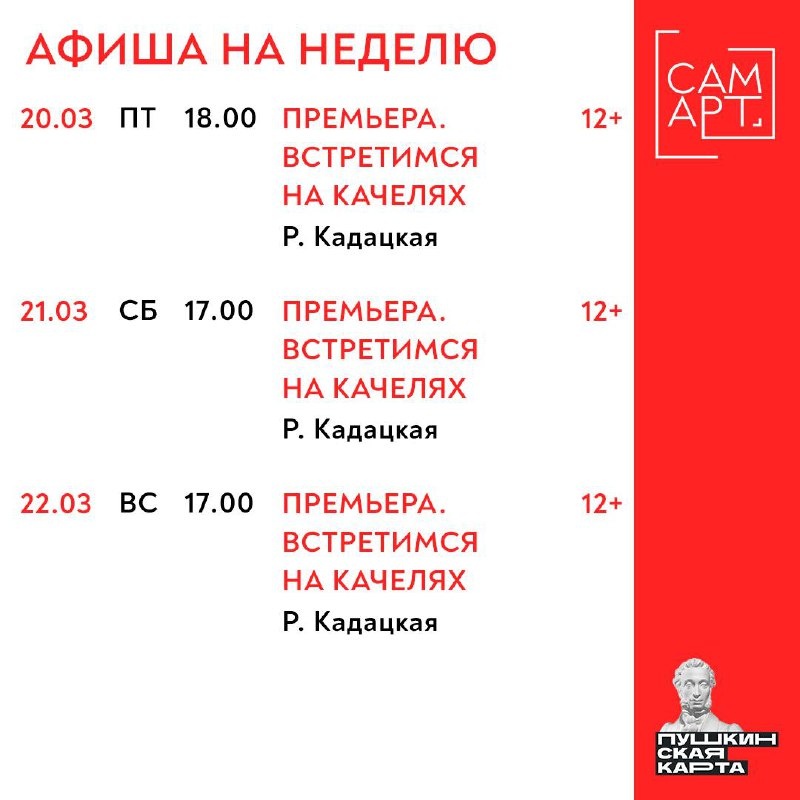 Идём на премьеру: 🟥 «Встретимся на качелях» | 12+ 20 марта | 18:00 21 и 22 марта | 17:00 11 апреля | 14:00 15 апреля | 18:00 19 апреля | 12:00 24 апреля | 18:00 13 и 14 мая | 18:00 Купить билеты