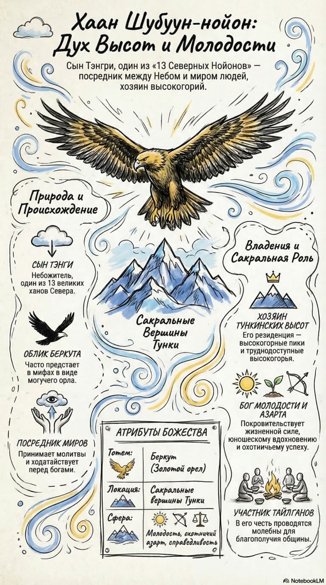 🦅 Хаан Шубуун-нойон, один из великих «13 Северных Нойонов», сыновей божественных Тэнгриев. Этот могущественный небожитель выступает посредником между Небом и миром людей, принимая молитвы и ходатайствуя за общину перед высшими богами. Чаще всего он предстает в облике величественного Беркута (Золотого орла). Его владения и сакральная роль: 🔹 Хозяин Тункинских Высот. Его резиденция — самые высокогорные пики и труднодоступные высокогорья Тунки. 🔹 Бог Молодости и Азарта. Он покровительствует жизненной силе, дарует юношеское вдохновение, обеспечивает справедливость и охотничий успех 🏹. Канал студии https://dzen.ru/id/670c7fe545d6d72caa724e37