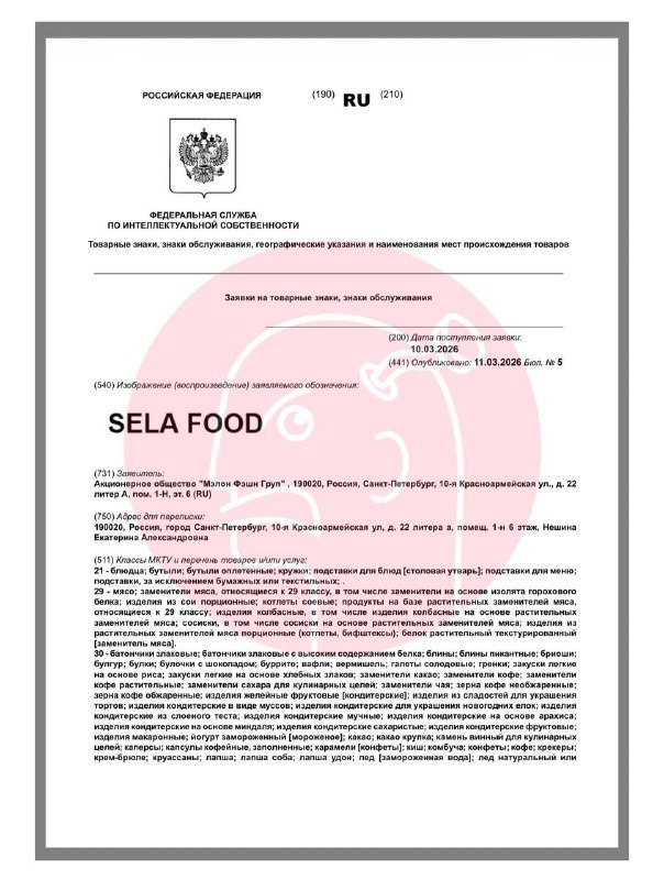 👗 Российский бренд SELA (под управлением Melon Fashion Group) готовится к масштабной диверсификации бизнеса! 10 марта 2026 года компания подала заявку на регистрацию товарного знака SELA FOOD в Федеральную службу по интеллектуальной собственности. 📄 🛒 Что войдёт в новое направление? Заявка охватывает широкий ассортимент товаров: * мясные и растительные аналоги мяса; * злаковые батончики; * блины; * макаронные изделия; * кондитерские изделия; * предметы посуды. Это не первый опыт расширения бренда: в 2025 году SELA успешно запустил линейку SELA HOME (товары для дома) — первый магазин открылся в ТЦ «МЕГА Ростов‑на‑Дону». Сейчас сеть насчитывает 152 собственных магазина, включая точки в Беларуси. 🏡 🤔 Зачем это нужно бренду? Melon Fashion Group стремится создать единую экосистему для клиента — от одежды до продуктов питания. Такой подход: * повышает лояльность аудитории; * увеличивает частоту взаимодействий с брендом; * позволяет использовать уже существующую розничную и логистиче
