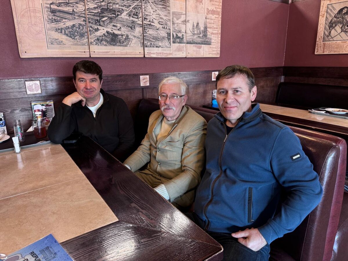 ? Дело было так. Как-то прошлой осенью мы с великолепным Матвеем Леонидовичем прогуливались по Светланской, старинной улице Владивостока. Вдруг впереди был замечен лучший строительный журналист Приморья, Виктор Анатольевич Кудинов, любивший одеваться шёголем, встреча с которым обыкновенно сулила удачу. Увидев такой шанс, мы пригласили его пообедать в кафе (фото №1), в здании, где раньше был легендарный магазин «Океан», а позже «Дары моря». Вступив в беседу, обнаружили, что интуиция нас не подвела – мэтр находился во временном творческом отпуске, и как раз подумывал, на какой достойный проект направить свои могучие силы. Идея пришла мгновенно – пишем строительную летопись Приморья! Надо сказать, что мы втроём провели долгое время под влиянием Владимира Васильевича Нескоблинова, которого очень любили, и чью книгу «Размах» (фото №2) зачитали до дыр. Она повествует о Главвладивостокстрое, о его 30-тилетнем славном пути, которые закончился печально, сбитый реформаторами-проходимцами, пра
