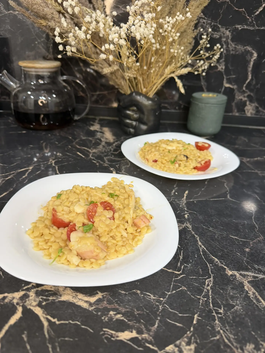 Хотите попробовать новое блюдо из птитим, но боитесь, что оно окажется сложным? Уверяю вас, всё получится проще простого! Всего за 10 минут у вас на столе появится ароматная паста, достойная ресторана. Давайте начнём! Ингредиенты: - Макароны Птитим — 200 г - Вода для варки - Морской коктейль — 100 г - Паста Том Ям (или простая томатная паста) — половина столовой ложки - Помидоры черри — 4 штуки - Сухой чеснок — щепотка - Лимонный сок — 10 мл - Сливки жирностью 10% — 80 мл - Соус Терияки — 10 мл - Натёртый сыр — 40 г Как приготовить: Шаг 1: Варим птитим Поместите макароны в кипящую подсоленную воду и варите согласно инструкции на упаковке (обычно около 8 минут). Когда макароны станут мягкими, слейте лишнюю воду и отложите их ненадолго в сторону. Шаг 2: Обжариваем морепродукты Пока птитим готовится, разогрейте сковороду с небольшим количеством масла. Добавьте морской коктейль и слегка обжарьте его пару минут, постоянно помешивая. Шаг 3: Добавляем ароматы В морепродукты добавьте поло