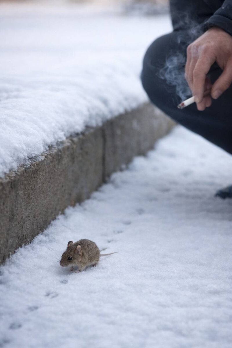 Я отправил фотографии одному ИИ-троллю и попросил разобрать, кто мог оставить такие следы. Заодно попросил его сгенерировать подходящую картинку, как он это видит. Диалог получился примерно такой. — Похоже на птицу. — Не похоже. У птиц видны пальцы и они передвигаются прыжками. — Тогда маленькое млекопитающее. Возможно мышь или полёвка. — Но хвоста не видно. — В рыхлом снегу хвост часто не отпечатывается. Дальше начали смотреть на детали. Следы идут спокойной цепочкой, почти по одной линии. Причём зверёк явно двигался вдоль стены и не прыгал, а именно шёл. Это довольно типичное поведение для маленьких грызунов. Они любят перемещаться вдоль границ — стен, бордюров, краёв тропинок. Там безопаснее. По размеру следов и характеру движения наиболее вероятная версия — маленькая полёвка или лесная мышь, которая ночью вышла из укрытия и спокойно прошла по своим делам. А картинку ИИ сделал примерно такую: маленькая мышь идёт по своим делам по снегу, а рядом стоит человек и курит, наблюдая