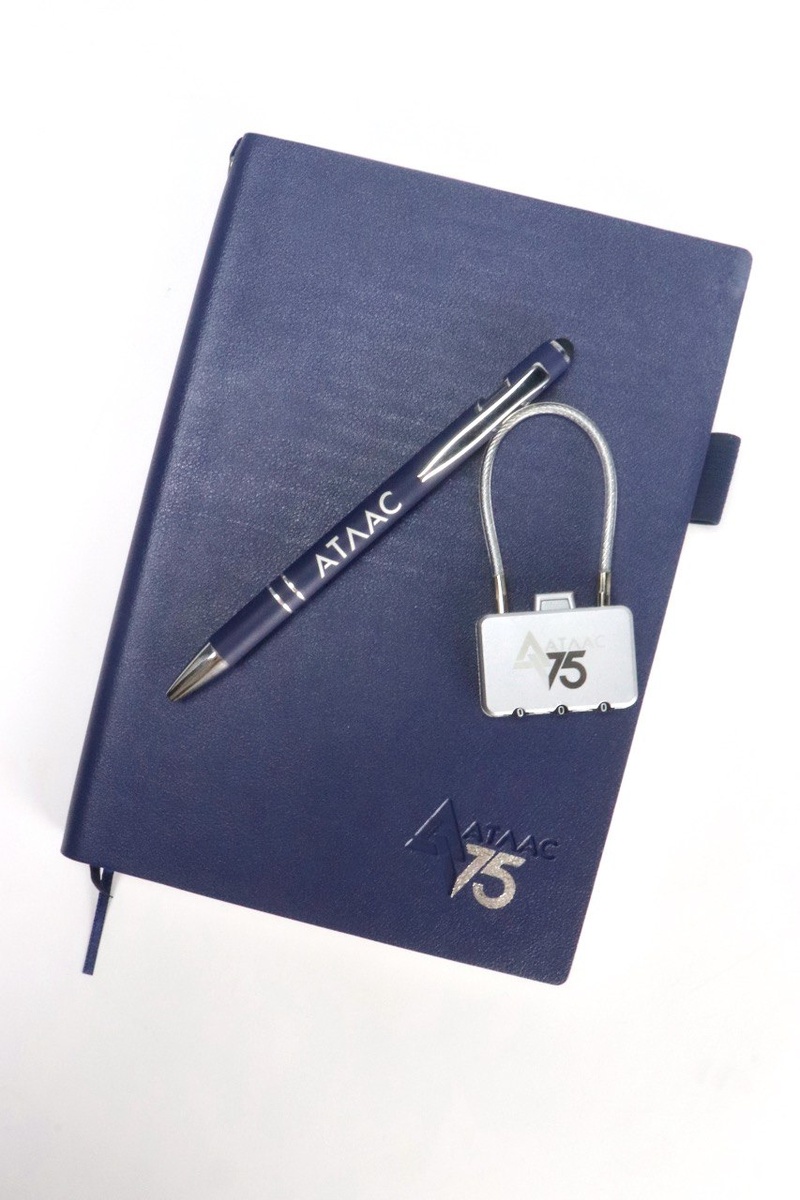 Комплексное решение для АО «НТЦ Атлас»: брендированный ежедневник, ручка и кодовый замок для багажа.