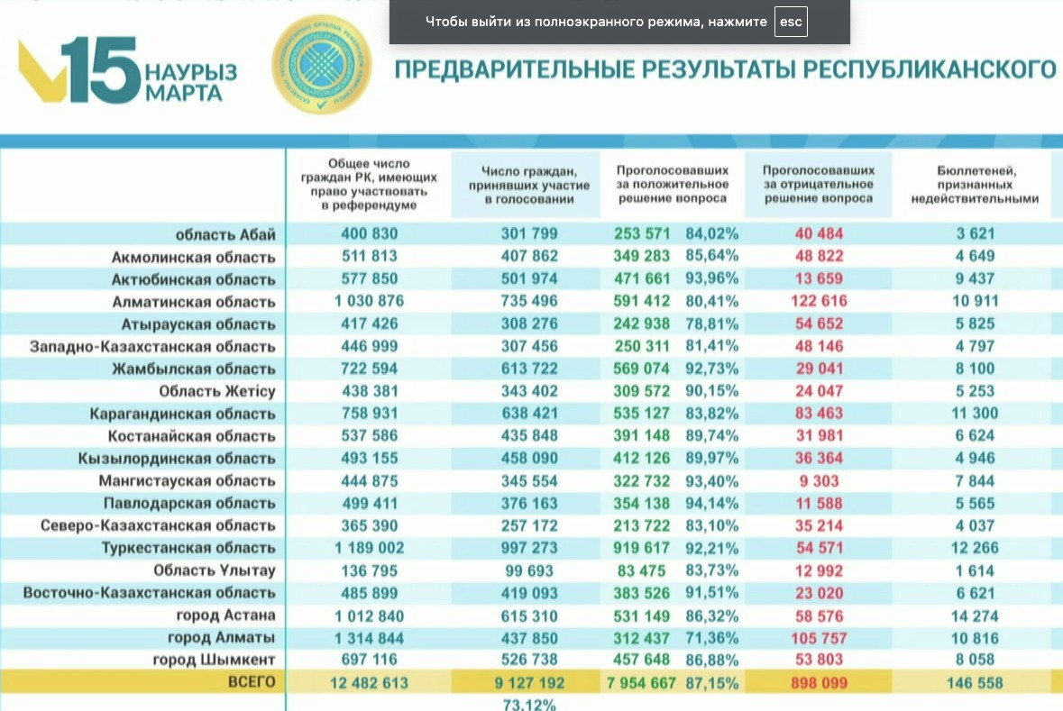 📊87,15 % казахстанцев проголосовали за новую Конституцию - официальные данные