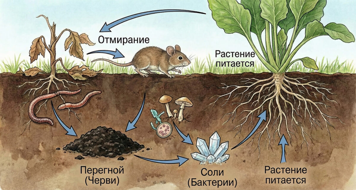 Мы привыкли думать, что удобрения предназначены непосредственно для растений. Кормим землю - кормим цветы и овощи. Но схема сложнее и интереснее. Между удобрением и растением стоит целая армия существ, без которых любая подкормка бесполезна. Кто живёт в почве? В одном грамме здоровой почвы обитает до миллиарда бактерий, километры грибных нитей, тысячи простейших, десятки нематод и мелких членистоногих. Это не просто "живность", это полноценная экосистема с разделением труда. ➖Бактерии. Разлагают органику, фиксируют азот, переводят минералы в доступные формы ➖Грибы. Разлагают целлюлозу и лигнин, создают микоризу с корнями растений ➖Актиномицеты. Производят антибиотики, подавляют патогены ➖Простейшие. Поедают бактерии, высвобождают азот ➖Нематоды. Регулируют численность бактерий и грибов ➖Дождевые черви. Перемешивают и аэрируют почву, создают гумус ➖Коллемболы. Поедают грибы и разлагающуюся органику Как это работает? Растения не могут напрямую потреблять органику. Корни всасывают только