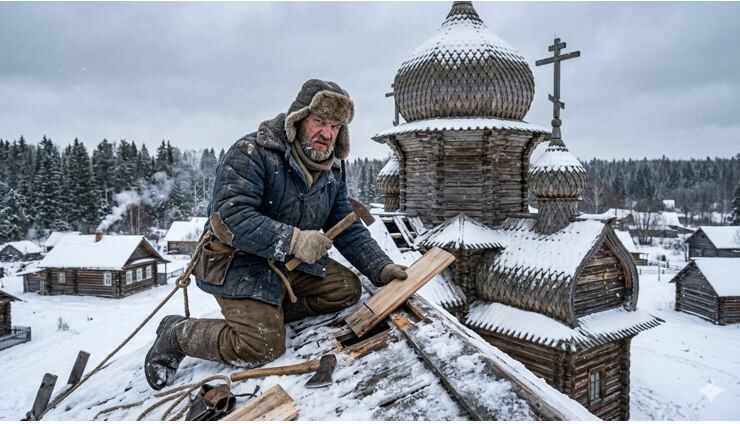 Тихон добрался до самого верха. Он закреплял последние листы железа у основания купола, когда с северной стороны ударил жёсткий порыв ветра. Нога его скользнула по льду. Одно мгновение он пытался удержаться, хватая воздух, — и сорвался.