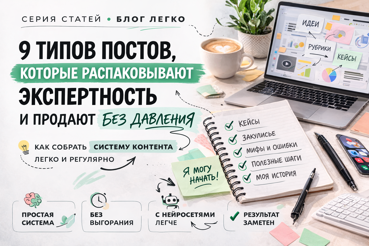 У многих экспертов контент выглядит так: сегодня полезняк, завтра личное, послезавтра тишина, потом “пост-знакомство”, потом снова тишина. И кажется, что проблема в дисциплине. На деле чаще всего проблема в другом: нет системы — из каких “кирпичиков” собирать контент. Есть простой подход: смотреть на себя не “как на автора”, а как на продюсера собственного проекта. То есть: “я — продукт, я — персонаж, я — бренд”, и моя задача — собирать контент так, чтобы человек видел путь, масштаб, подход и результаты. Ниже — 9 типов контента, которые можно чередовать. Это не “рубрики ради рубрик”, а блоки, которые закрывают разные вопросы аудитории: “ты кто?”, “почему тебе верить?”, “как ты работаешь?”, “что я получу?”, “почему именно ты?”. Это история “было → стало”, но не сухими цифрами, а через процесс и выводы. Пример (психолог):