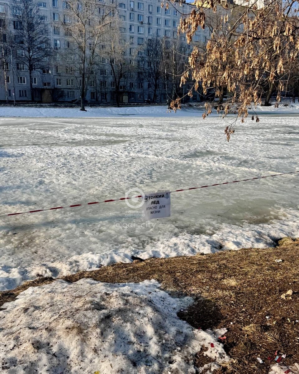 После трагедии в Звенигороде на Комсомольском пруду в Одинцово (возможно, впервые) натянули красную ленточку и повесили предупреждение о тонком льде