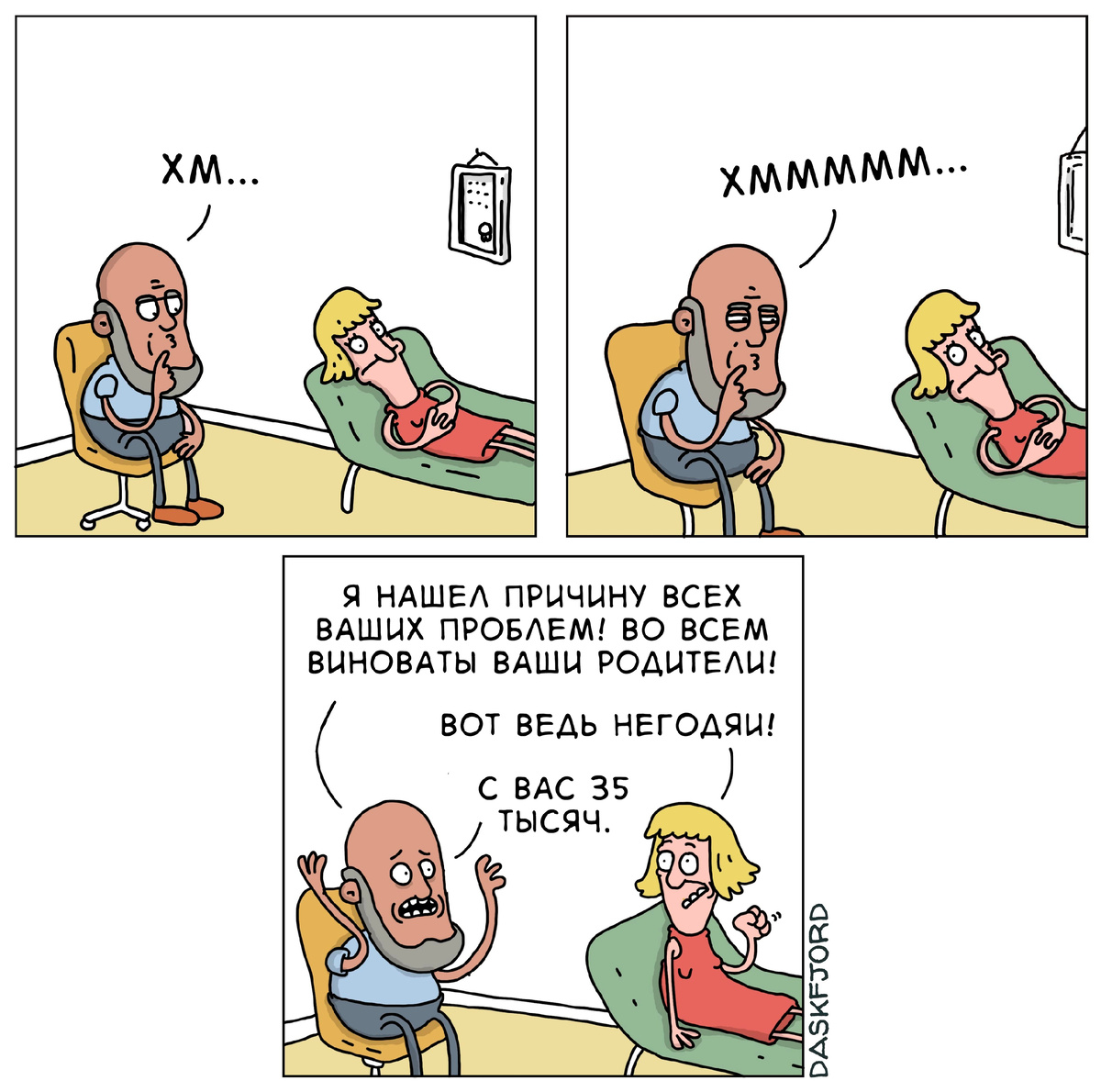 14.04 Психотерапия в современном мире становится все популярнее и популярнее - спрос на данные услуги растет, а количество специалистов и сервисов постоянно увеличивается. И, как это обычно и бывает, любая популярная тема почти сразу же становится поводом для многочисленных шуток. Сегодня я собрал для вас десятку отличных комиксов и карикатур про походы к психологам, необычных клиентов и проблемы известных персонажей. Надеюсь, что вам понравится! Норвежский художник Давид Скауфьорд (David Skaufjord) - создатель серии комиксов Daskfjord! (название собрано из первых букв имени и фамилии автора) - в своих работах часто иронизирует над современном обществом. И в одной из своих зарисовок этот автор решил очень упрощенно показать типичный поход к психологу. Cерия комиксов Cyanide and Happiness («Цианид и Счастье») от американских художников Дэйва МакЭльфатрика (Dave McElfatrick), Криса Уилсона (Kris Wilson), Мэтта Мэлвина (Matt Melvin) и Роба ДенБлэйкер (Rob DenBleyker) не нуждается в особом