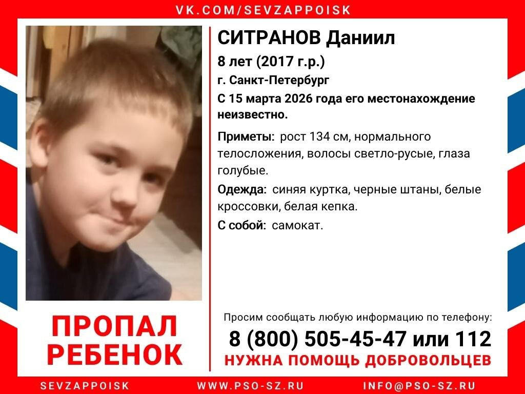 Поисково-спасательный отряд «Северо-Запад» в соцсетях объявил в розыск 8-летнего мальчика. Известно, что Даниил Ситранов исчез вместе с самокатом накануне, 15 марта. Приметы мальчика: рост 134 см, нормального телосложения, волосы светло-русые, глаза голубые. Он одет в синюю куртку, чёрные штаны, белые кроссовки и белую кепку. Ранее в Петербурге 4-летний мальчик ушел из дома без одежды.