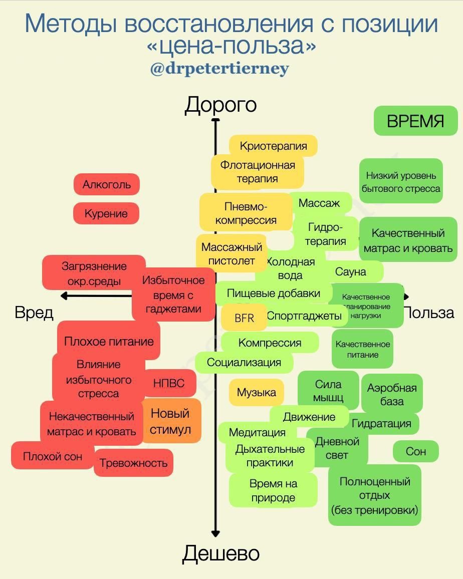 Никаких секретов! Всё самое эффективное всем известно: сон, питание, сауна, умеренная подвижность. Интересные методы восстановления соотношения «цена-польза» на картинке😜 Уже сегодня вечером выйдет первая часть рассказа о БЭКъярде в Йошкар-Оле🔥